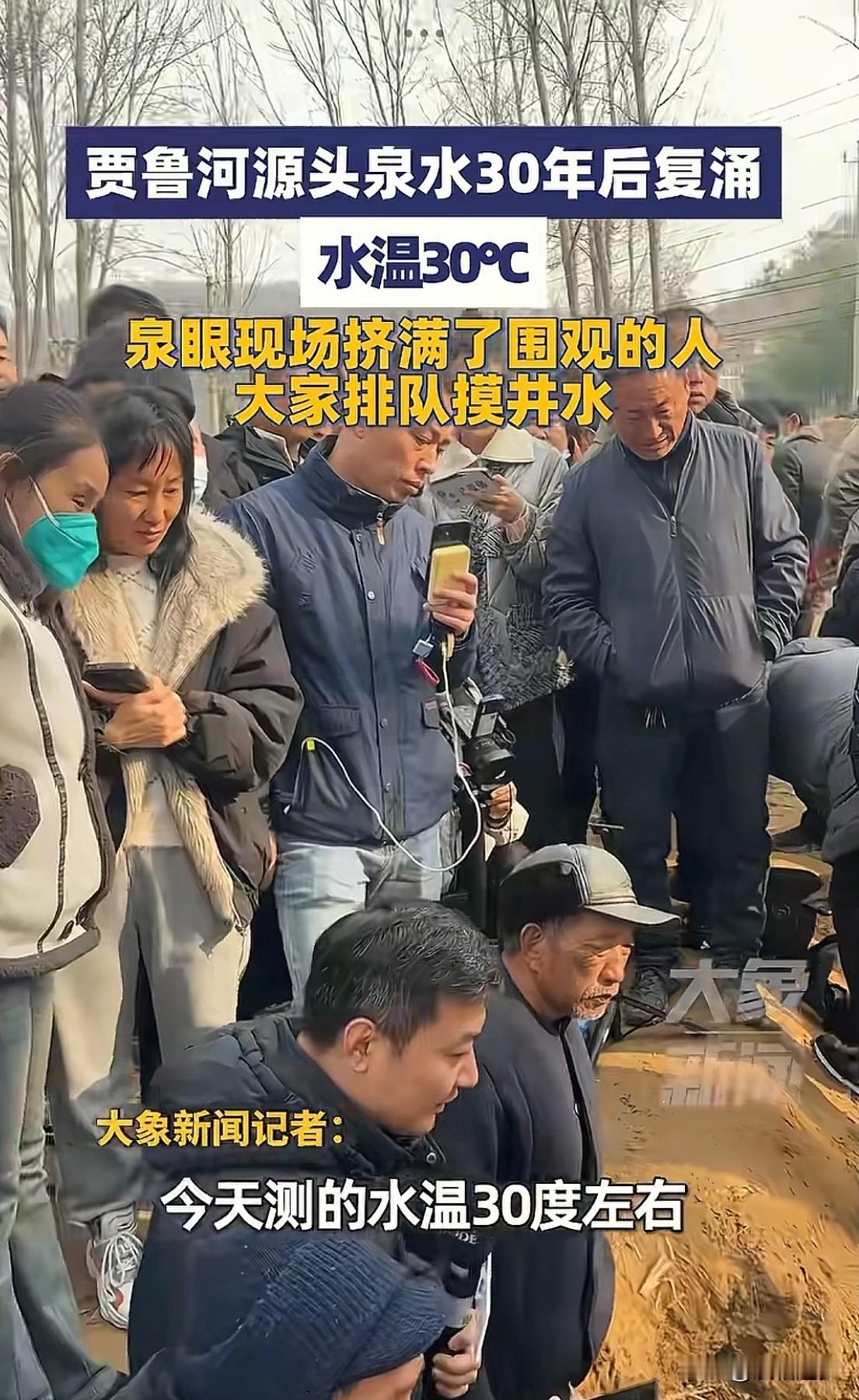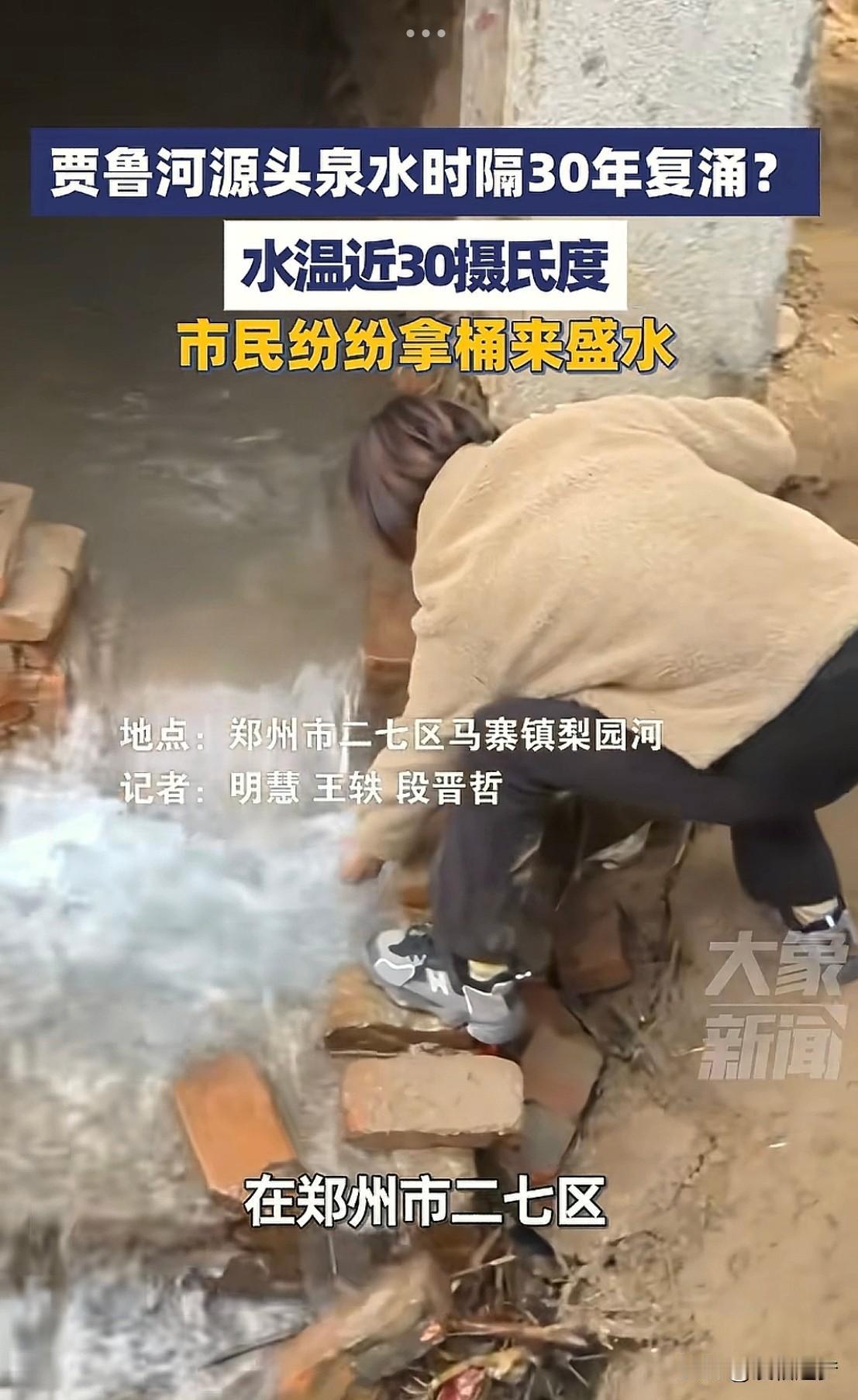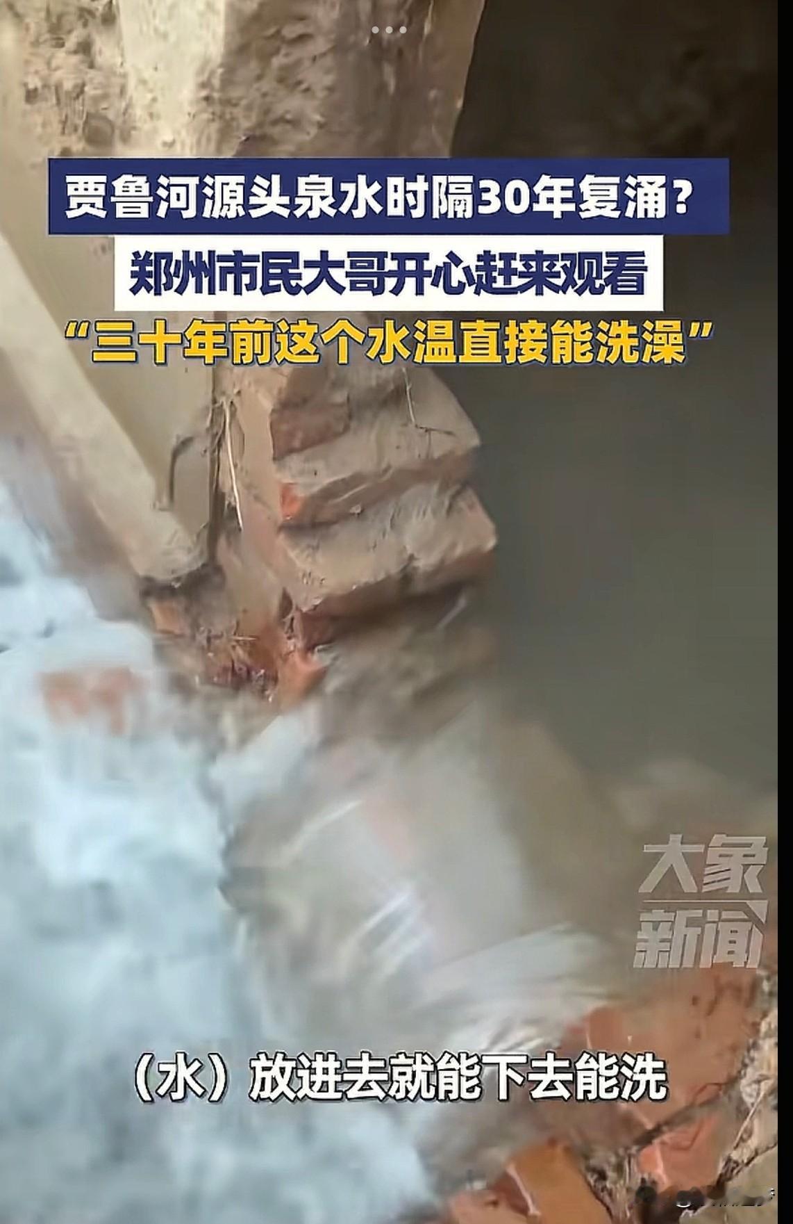 “太惊喜了!”河南郑州,一口干涸30年的泉眼,忽然重新涌出了泉水!不是人为刨出来的,也不是接了地下的管子,而是实实在在的地下水,更让人意外的是,流出来的水温竟然达到了30度左右。现场村民笑得合不拢嘴,纷纷排队摸泉水沾喜气! 以前只在电视上听说,哪条河流干涸后,过了几十年突然有了水,如现实里遇到这样的情况,真惊喜又意外。 根据大象新闻12月9日报道,这件“失而复得”的喜事就发生在一村子里,复涌的是贾鲁河源头的泉水。 村民透露,在一眼废弃的机井口里忽然流出了近30度的温水,尤其在大冷天特别明显,河道上雾气昭昭,当地居民纷纷拿着桶来盛水,消息一出,很多媒体记者也赶往当地确认。 有村民还回忆起30年前这里的泉水情况,那时候比现在温度还高,那时候这里还有个池子,水干净的可以洗澡,打出来的水,不用加热,拿到家里就可以洗澡。如今能够再次恢复,村民别提多高兴了! 而记者也联系了一位专 业人员实地探访,原来这是一种水文现象,通俗的说,就是这30年,当地的生 态环境很好,采矿挖煤也不存在了,并且今年秋季下雨也对地下水进行了补给,这才产生了复涌的现象。 有网友说:他们村该唱大戏啦,这种好事一定要庆祝一下! 这事真的越品越暖!干涸30年的泉眼突然冒温水,分明是生 态环境好,给咱老百姓的回头礼啊! 30年前能直接舀水洗澡,后来慢慢断流,现在又带着暖意回来,这背后不就是保护环境大自然的回馈咱吗?大自然的“因果循环”来得多实在! 虽然不是啥惊天动地的大事,但是就“失而复得”这新鲜劲,看着就觉得心里暖和。 希望这股泉水能一直流下去,也盼着更多地方能有这样的“惊喜”,好的环境,终究会有回报的!