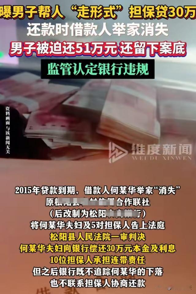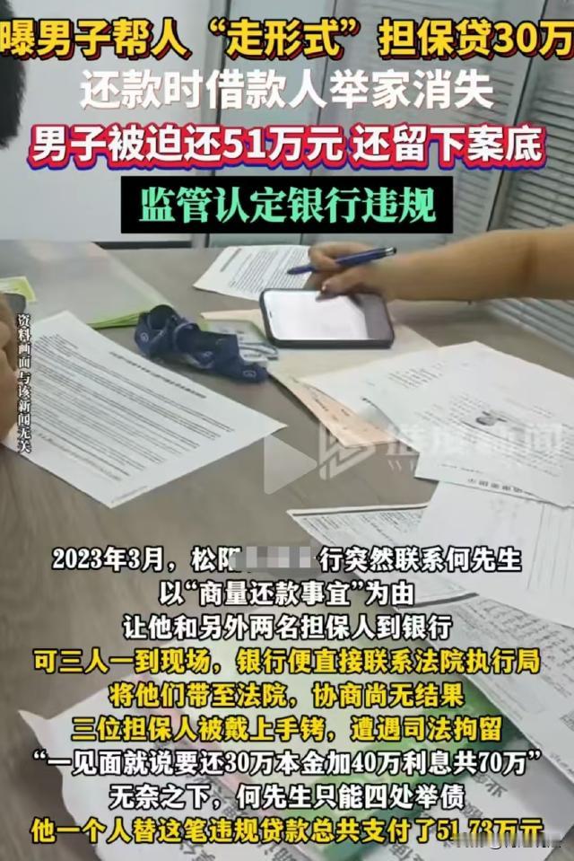 浙江丽水,12年前,一村民找到何先生,称他已经打点好了关系,请何先生走个过场帮忙担保贷款30万。到了还款时间,贷款人举家消失,何先生不仅被拘留,还被迫还款50多万。 2013年,何先生在老家农村种香菇,年收入只有两三万元,同村村民阿华是何先生的本家远亲。 当年12月,阿华找到何先生家,称他要贷款30万,想让何先生给他做担保。 当时,何先生已经帮两个亲戚担保了20万,根本没有再次担保的资格。 可阿华摆摆手,说他已经打点好关系了,何先生只需要走个过场,在担保人一栏签个字就行了,不用承担法律责任。 阿华软磨硬泡,何先生抹不开面子,念在大家都是一个村的份上给阿华签了字。 除了何先生,村里另外还有4家8个人共同给阿华做保,这些人和何先生一样,要么收入太低,要么已经替别人担保了,全部没有担保资格。 两年后到了还款时间,阿华一家全部消失,放款行找不到阿华,就将阿华、何先生夫妇及另外4对担保人全部起诉了,要求追究担保人的连带担保责任。 不久,一审判阿华偿还30万本金及利息,其余10个担保人承担连带责任。 可是,判决生效后,该行并没有追查阿华的行踪,也未找他们10个担保人协商还款,判决生效后,也没有申请执行。 此后,何先生外出打工攒了点钱,到县城里开了一家门窗店,做起了生意。 转眼就是8年过去,2023年3月,借款行突然联系何先生,让他和另外两个担保人一起去协商还款事宜。 可几人刚到场,该行就联系执行人员将他们带走了。 该行表示,何先生等人要偿还30万本金加40万利息,一共70万。 何先生等人都是老实巴交的农村人,哪里来这么多钱?协商无果,何先生等3个担保人被戴上手铐司法拘留了。 事发后,何先生的家属连夜到处借钱,凑了12万,何先生这才被放了出来。 同年5月,村里出面进行协商,该行同意减免部分利息,可其他4对8个担保人家里都非常困难,4家一共才凑了6万块钱。 何先生没办法只好到处借钱,7月1日,又向该行转了36万及7300元的诉讼费和执行费,这件事才算暂时结束。 也就是说,何先生一个人就出了51.73万,还背上了几十万的外债。 何先生不服,他认为,12年前的那次担保本来就是违规的,于是,不甘心的他进行了举报。 2025年10月,当地金融监管局出具了一份《金融违法线索认定意见书》,明确指出该行没有充分调查借款人的经营情况,没能有效监督贷款资金,存在放贷前调查不到位和放贷后管理不到位的情况。 可是,何先生的问题还是没有解决,他担心影响孩子的未来,想要撤销自己被拘留的案底,追回自己垫付的50多万,但是该行一直没有回应。 1、借款行在本案中是否存在违规? 《商业银行法》第三十五条规定:商业银行贷款,应当对借款人的借款用途、偿还能力、还款方式等情况进行严格审查。 《贷款通则》第二十七条规定:贷款人受理借款人申请后,应当对借款人的信用等级以及借款的合法性、安全性、盈利性等情况进行调查,核实抵押物、质物、保证人情况,测定贷款的风险度。 本案中,当地金融监管局明确指出,该行没有充分调查借款人的经营情况,没能有效监督贷款资金,存在放贷前调查不到位和放贷后管理不到位的情况。 这表明,该行在贷款发放和管理过程中,违反了上述法律规定,存在明显的违规行为。 2、这种情况下,何先生等10人签订的担保合同是否有效? 《民法典》第一百四十三条规定,具备下列条件的民事法律行为有效: (一)行为人具有相应的民事行为能力; (二)意思表示真实; (三)不违反法律、行政法规的强制性规定,不违背公序良俗。 何先生等担保人本身可即便不具备担保资格,但担保资格审查属于该行内部规定,并非法律或行政法规的强制性规定。 何先生等人抹不开面子,给阿华担保,属于自愿作出的意思表示,不存在被欺诈、胁迫或与该行、借款人恶意串通等导致合同可撤销或无效的法定情形。 因此,何先生等担保人签下的担保合同符合生效要件,是有效的。 3、阿华消失,何先生等人是否要承担连带责任? 《民法典》第六百八十八条规定:当事人在保证合同中约定保证人和债务人对债务承担连带责任的,为连带责任保证。连带责任保证的债务人不履行到期债务或者发生当事人约定的情形时,债权人可以请求债务人履行债务,也可以请求保证人在其保证范围内承担保证责任。 本案一审判阿华偿还30万本金及利息,其余10个担保人承担连带责任。 但由于阿华举家消失无法偿还债务,该行有权要求何先生等担保人承担连带担保责任。 虽然该行存在违规行为,但这并不影响担保合同的效力,何先生等人仍需按照合同约定承担相应责任。 担保不是闹着玩,担保合同更是不能乱签,万一出现纠纷,后悔就来不及了。 维度新闻、大风新闻