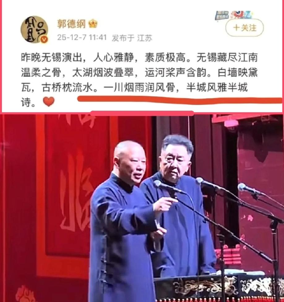 郭德纲被约谈后, 德云社全体沉默, 不为别的,就是在这种情况下,全体上下不给自己师傅添堵。 没人出来辩解互撕,也没人借机炒作,徒弟们齐刷刷闭麦,不给师傅添乱,反而用沉默稳住了局面。更绝的是老郭,发微博说演出照常,一句“一川烟雨润风骨,半城风雅半城诗”直接封神。 没文凭不代表没文化,这格局和文采,比一堆辩解话管用多了。德云社没纠结争议,反而连夜整改节目、搞三重审核,用行动回应问题,这才是成熟团队该有的样子。 其实争议的核心哪儿是低俗,是大家对相声的期待——既要接地气的鲜活,又要守得住边界。你觉得相声的“魂”该是鲜辣讽刺,还是合规稳妥?