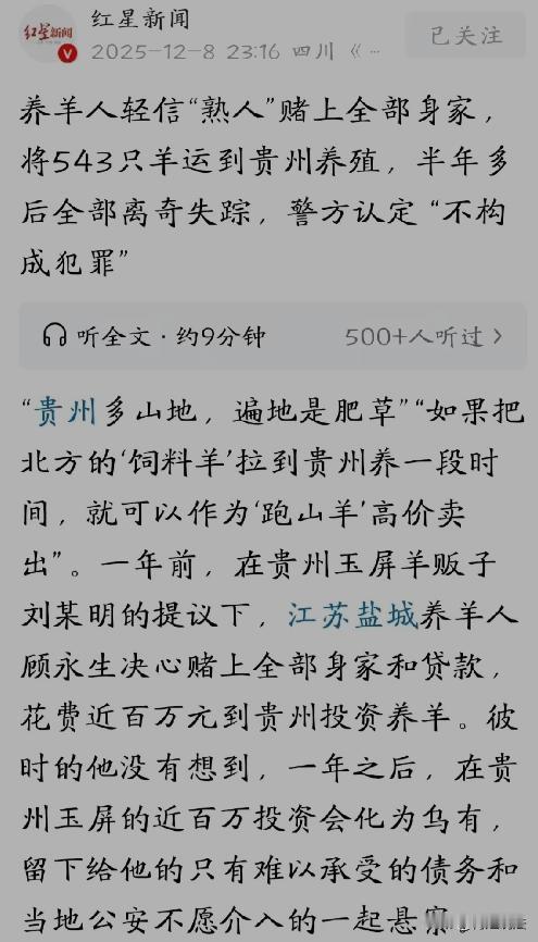 贵州,顾先生听熟人刘某明建议,把价值89.4万的543只羊运到贵州玉屏县让儿子养殖,不到半年,羊陆续不见,只剩120多只,儿子发现刘某明把两群羊弄混,卖自己羊时也卖了顾先生的羊,还不断补新羊,顾先生报警,警方先认为是经济纠纷,刘某明赶走顾先生儿子并占有剩余羊。顾先生再次报案,警方先以诈骗立案后又撤销,认定刘某明不构成犯罪。如今羊下落不明,刘某明失联,顾先生还欠债,媳妇卧病在床。 顾先生和妻子一直养羊贩羊,之前在盐城,后来去了河南。 2024年,行情不好,熟人刘某明说把饲料羊运到贵州玉屏养一阵,包装成跑山羊、草饲羊能卖高价,顾先生心动了。 顾先生满心期待着这批羊能带来转机,他拿出全部家底,还贷了款,分三次花89.4万买了543只羊。 他看着这些羊,仿佛看到了未来的好日子,对儿子说,儿子,这批羊可得好好养,等卖了好价钱,咱家日子就能好起来。 儿子拍着胸脯保证,爸,你放心,我有技术,肯定把羊养得肥肥壮壮的。 就这样,儿子带着羊前往玉屏后,儿子每天照料着羊群,还时不时和顾先生汇报情况。 可到了2024年9月,儿子突然打来电话,声音焦急又无奈,爸,羊出问题了,现在就剩120多只了。 顾先生脑袋嗡的一下,差点没站稳,他急切地问,咋回事,好好的羊咋能少这么多。 儿子说,刘某明经常把贩来的羊混进养殖场,卖自己羊的时候,也把咱家的羊给卖了,然后再补新羊进来。 顾先很生气,这刘某明怎么能干出这种事,我得找他理论理论。 顾先生立刻赶到玉屏,找到刘某明,愤怒地说,刘某明,你为啥要偷我家的羊,这可都是我贷款买的,你要是不把羊还回来,我和你没完。 刘某明却一脸无所谓,说,什么你家的羊,大家混养着,哪分得清,再说了,我也不是白拿,之后会补回来的。 儿子接着说,刘某明经常把贩来的羊混进养殖场,卖自己羊的时候,也把顾先生的羊给卖了,然后再补新羊进来。 顾先生又气又急,赶紧报了警。 他心想,这刘某明太过分了,这不是坑人吗? 可警方来了之后,调查了一番,说这是经济纠纷,让顾先生和刘某明自己协商解决。 顾先生傻眼了,这怎么就成经济纠纷了? 自己的羊不明不白地少了这么多,刘某明这不是盗窃吗? 可警方有自己的判断依据,他们觉得目前没有足够的证据证明刘某明一开始就有非法占有的目的,可能只是合作过程中出现了问题。 顾先生没办法,只能先回家等着。 没想到,没过多久,刘某明竟然把他儿子赶走了,还占有了剩下的羊。 顾先生这下彻底火了,再次报了案。 警方这次立案了,可没过几天,又撤销了。 2025年1月2号,警方给出结论,认定刘某明不构成犯罪。 顾先生怎么也想不明白,自己的羊没了,钱打了水漂,还欠了一屁股债,媳妇也因为这事气得卧病在床,刘某明咋就不构成犯罪呢? 他四处打听,想找个说法,可刘某明失联了。 羊也不知去向,顾先生感觉自己掉进了一个无底洞,怎么爬都爬不出来。 这好好的一个家,就因为听了刘某明的话,搞成现在这个样子。 顾先生后悔不已,要是当初不听刘某明的忽悠,多实地考察考察,签好合同,也不至于落到这般田地。 现在说什么都晚了,只能盼着能有个转机,把损失挽回一点。 刘某明的行为,到底算不算犯罪呢?难道就因为他前期有正常合作,变卖羊只后承认欠款25万元,就能逃脱法律的制裁吗? 从法律层面看,诈骗罪是指以非法占有为目的,用虚构事实或者隐瞒真相的方法,骗取数额较大的公私财物的行为。 警方撤销案件,认定刘某明不构成犯罪,是因为难以证明刘某明一开始就意图骗取财物。 刘某明前期和顾先生有正常合作提议,在变卖羊只后还承认欠款25万元,这些行为让警方难以认定他一开始就抱着非法占有顾先生羊只的目的。 侵占罪,是指以非法占有为目的,将他人的交给自己保管的财物、遗忘物或者埋藏物非法占为己有,数额较大,拒不交还的行为。 刘某明把贩来的羊混进养殖场,卖自己羊时也卖顾先生的羊,之后占有剩余羊只,这种行为看似符合侵占罪的特征。 但侵占罪要求:行为人将代为保管的他人财物非法占为己有,刘某明和顾先生之间,并没有明确的代为保管关系,所以也难以认定为侵占罪。 从民事角度看,刘某明和顾先生之间,存在合作关系。 刘某明在合作过程中,未经顾先生同意,擅自处理顾先生的羊只,给顾先生造成了损失,这属于违约行为。 顾先生可以依据民法典中关于合同违约的规定,要求刘某明赔偿损失。 投资时,容易被熟人忽悠,觉得熟人不会坑自己,就放松了警惕。 不实地考察,不签合同,一旦出了问题,就陷入被动。 就像顾先生,听刘某明说能赚钱,就盲目投资,结果血本无归。 投资要谨慎,不能光听别人的一面之词,要做好充分的调查和准备。 顾先生只能通过民事途径,起诉刘某明,要求其赔偿损失。 但刘某明失联,执行起来难度很大。 做任何投资都要擦亮眼睛,别被利益冲昏头脑。