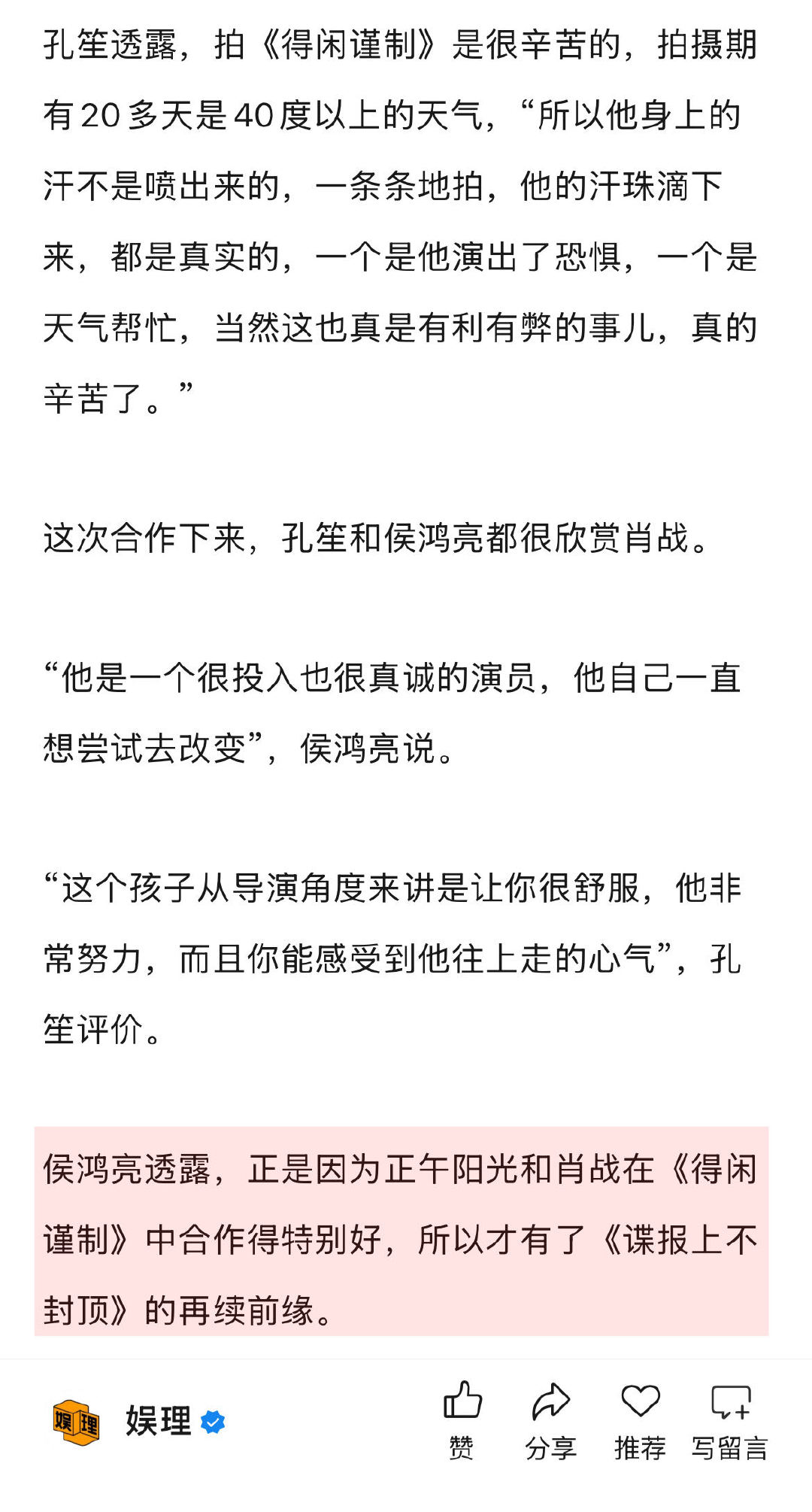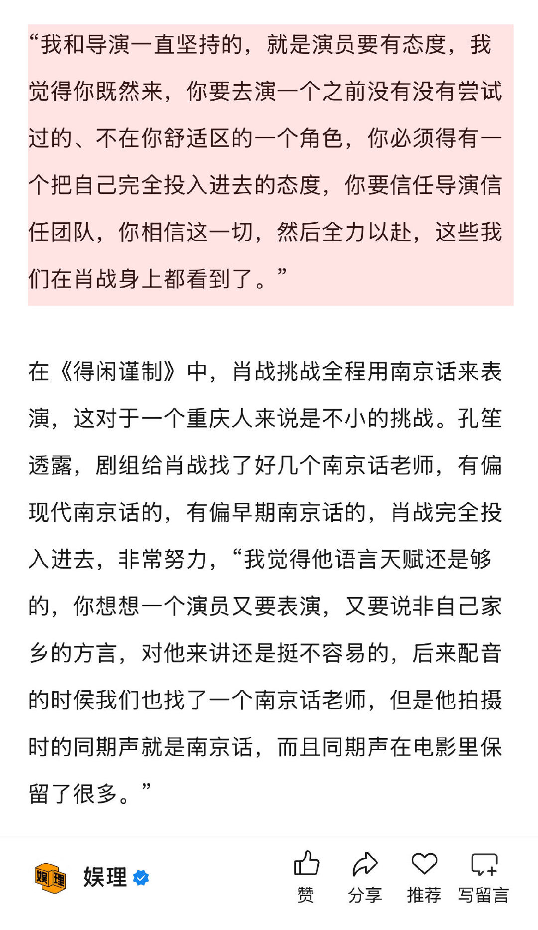 孔笙说肖战有往上走的心气 孔笙和侯鸿亮都很欣赏肖战 肖战在《得闲谨制》全程挑战用南京话表演,剧组给他找了好几个南京话老师,孔笙说肖战完全投入进去,非常努力,“我觉得他语言天赋还是够的,一个演员又要表演,又要说非自己家乡的方言,对他来讲还是很挺不容易的,后来配音时也找了一个南京话老师,但是他拍摄时的同期声就是南京话,而且同期声在电影里保留了很多。”新浪娱乐专访孔笙侯鸿亮↓