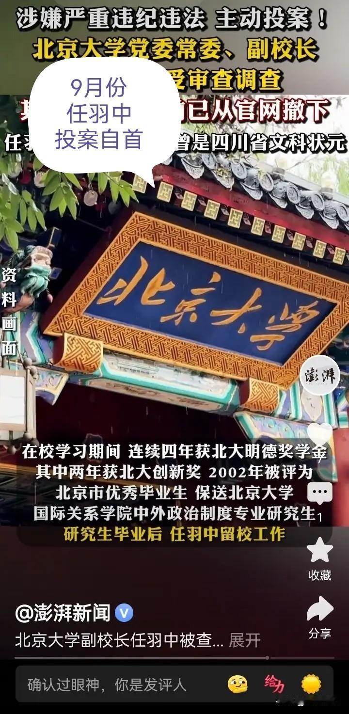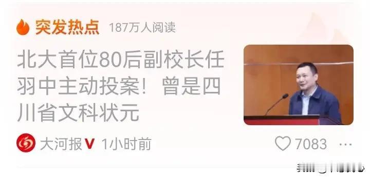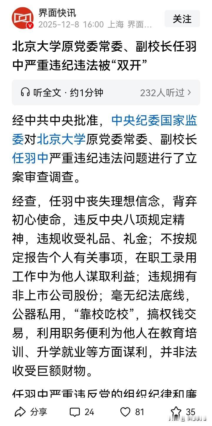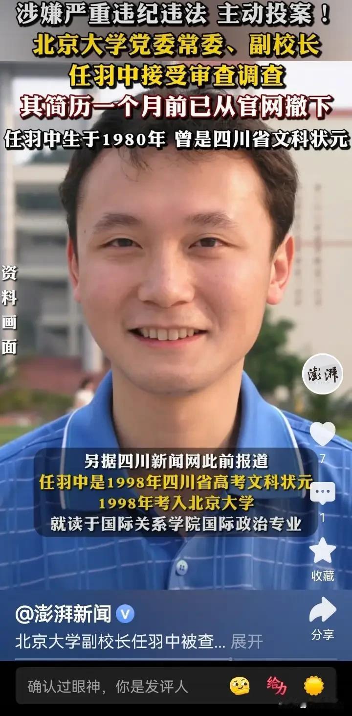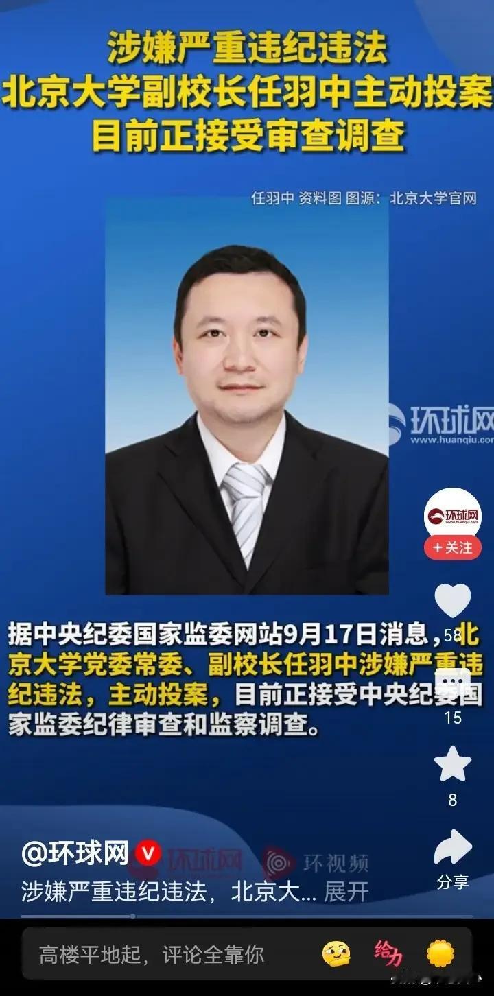 3个月前投案自首的,80后北京大学原副校长任羽中,有新消息了。今天出来的最新消息,此人被双开,并已经被立案审查调查。 还是熟悉的原因、结果。任羽中“丧失理想信念,背弃初心使命”,然后进行了一系列的违法违纪活动,包括“违规收受礼品、礼金”等等,又毫无纪法底线,公器私用,“靠校吃校”,搞权钱交易,利用职务便利为他人在教育培训、升学就业等方面谋利,并非法收受巨额财物。 要知道,他可是北京大学的副校长,一句“靠校吃校”,可知他的活动空间有多大,又比如他涉及的“升学就业”,那不知道高考的公平公正到了他这里,会不会也是荡然无存?! 贪官的追求,权力、金钱、美色,起码要占其中一个,任羽中的“巨额财物”,也不知道有没有达到小目标级别。 任羽中曾经在高考取得文科状元,在北京大学读书期间也取得很好的成绩,所以后续才有他在北大工作,逐步晋升到了副校长,最年轻的一个。 在大家看来,用“饱读诗书”、“前途不可限量”来形容,一点也不过分。要知道他可是文科状元读的北大,还是80后,很年轻了! 任羽中的大好前途因为违法违纪而毁于一旦,这是教育的失败,还是人性的堕落呢?值得深思啊!