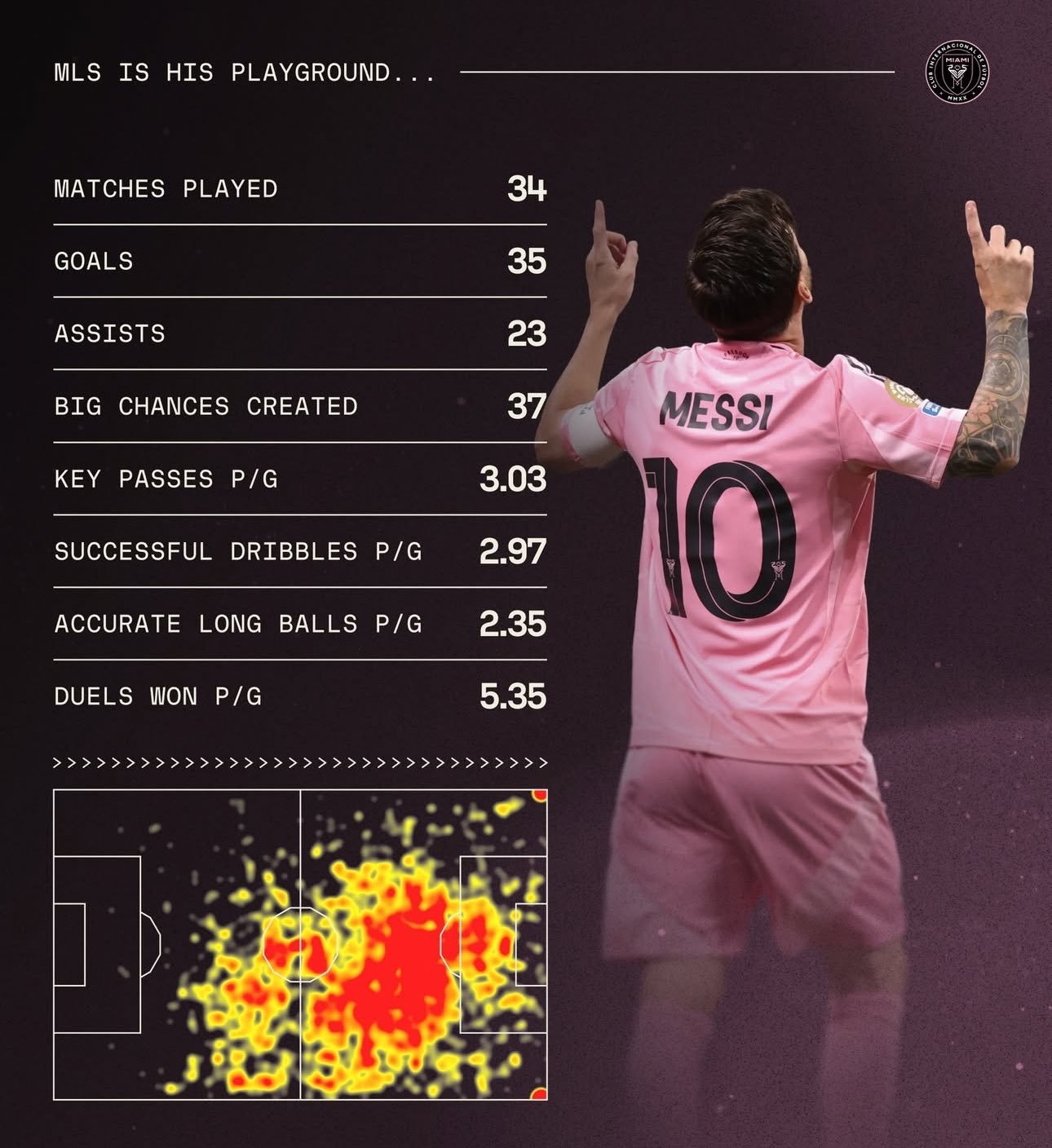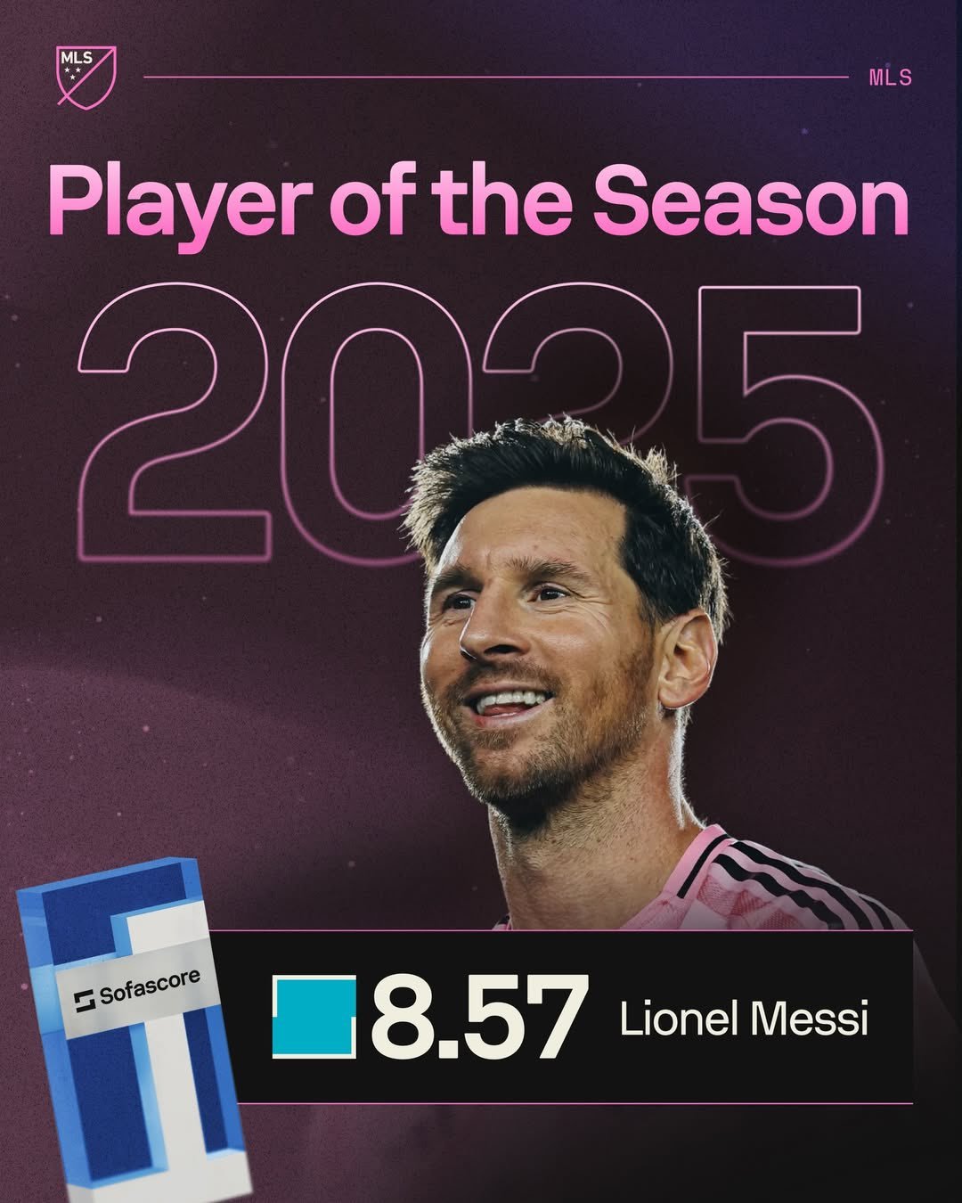 🎉梅西获得美职联2025赛季SofaScore最佳球员奖!场均评分8.57、34场比赛、35粒进球、23次助攻、创造绝佳机会37次、场均关键传球3.03次、场均成功过人2.97次、场均精准长传2.35次、场均赢得对抗5.35次梅西梅西