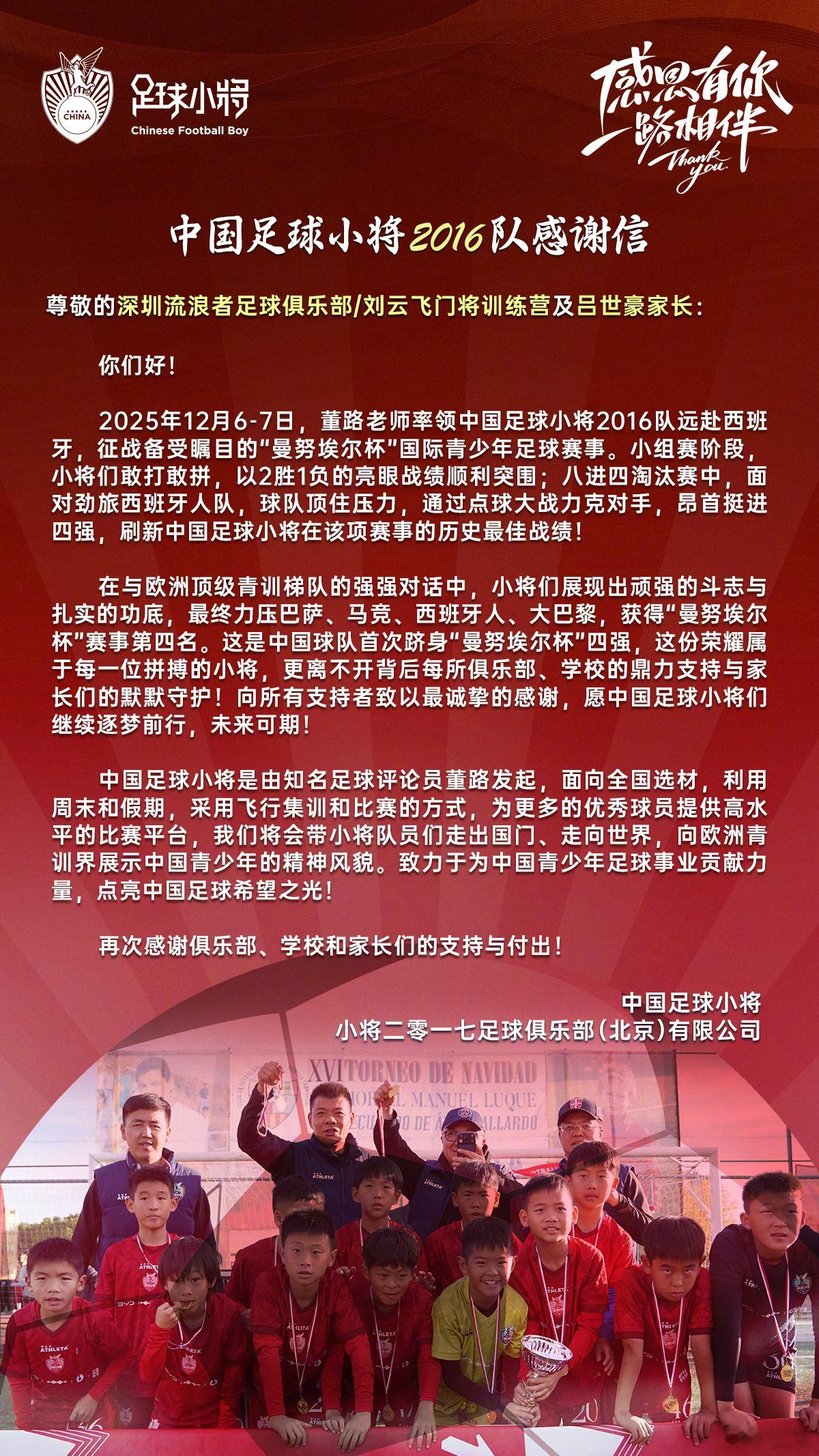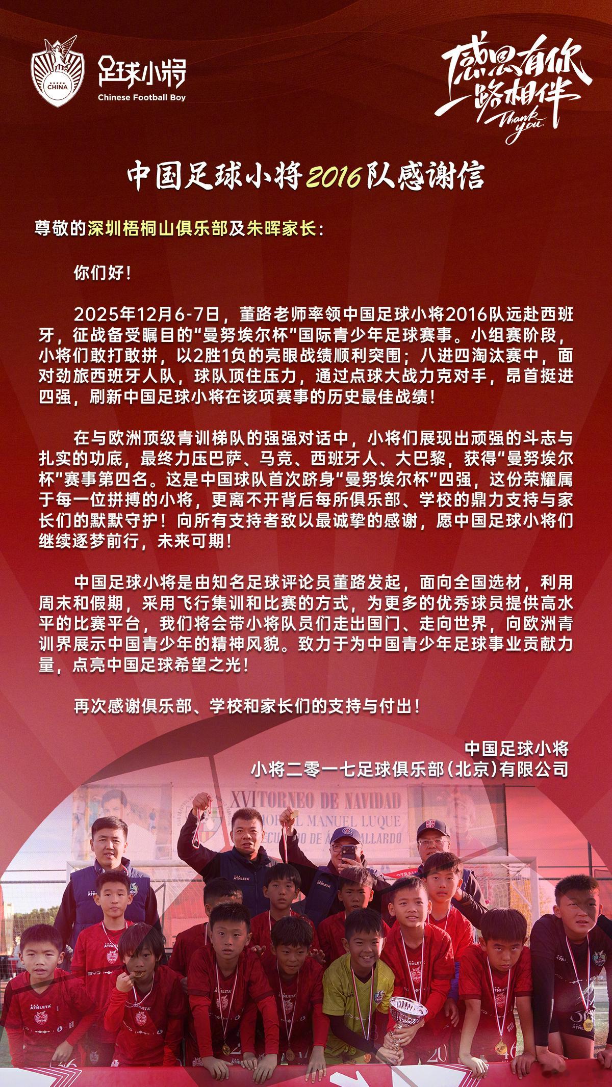 中国足球小将 2016感谢信曼努埃尔杯历史性杀进4强这是我们共同的荣誉!