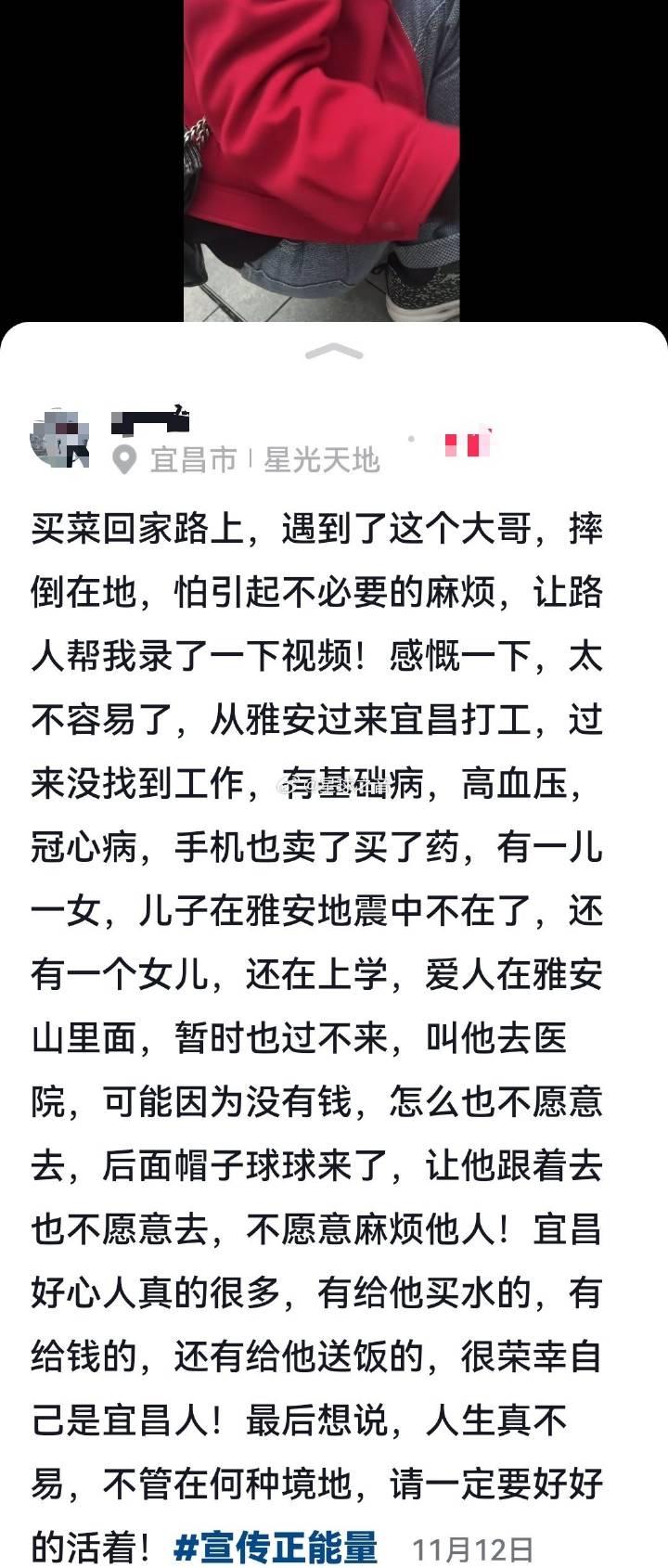 四川雅安大哥在宜昌街头晕倒,被路过买菜的宜昌市民救助。这个大哥来宜昌找工作,工作