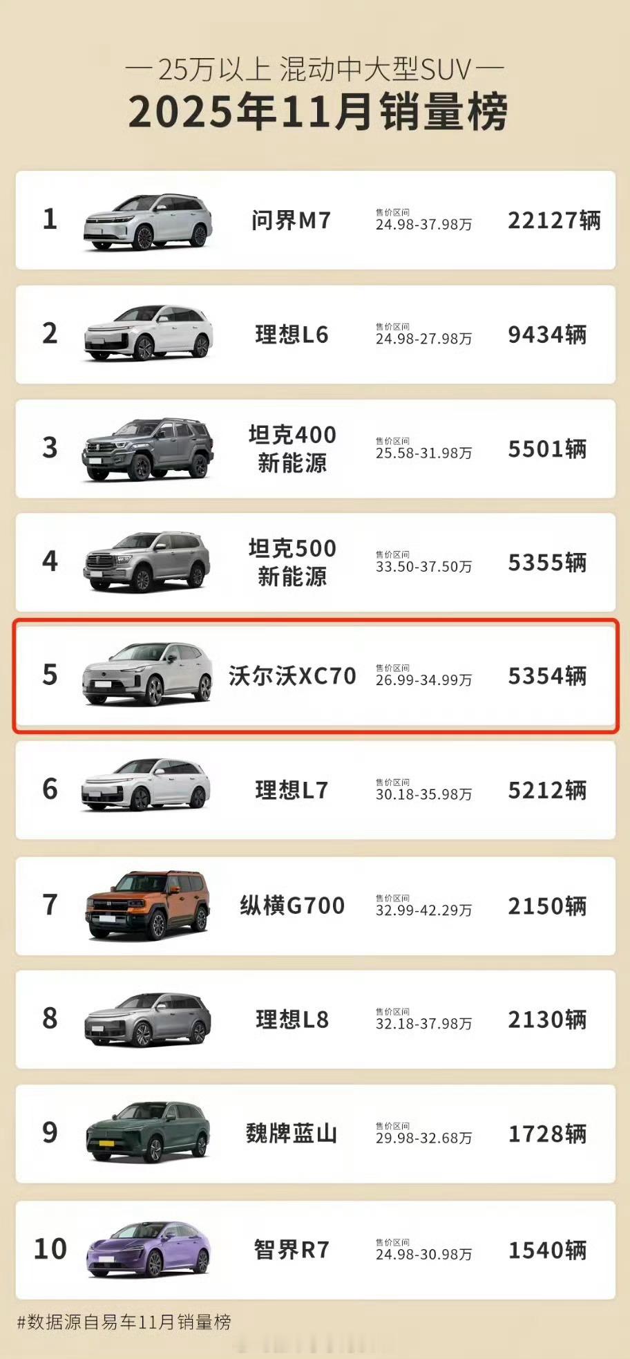 沃尔沃XC70销量超越理想L7这就很尴尬了,本以为混动中大型SUV市场被国产新势力占尽风头,事实也的确差不多如此,因为前十里面九个都是国产各种新势力,而这个唯一的意外就是沃尔沃XC70。甚至还超过了理想L7,传统豪华品牌这是杀了个回马枪。理想L7和理想L8就很尴尬,曾经的热销车型,现在竟然卖不过沃尔沃。沃尔沃全新XC70的确好卖,26.99-34.99万,上市70天,销量突破10000辆,动力电池方面,沃尔沃XC70最大电池容量39.6kWh,支持快充,从SOC 0-80%需23分钟,车辆CLTC纯电续航里程最高可达200km,综合续航可达1200km;动力系统部分,沃尔沃XC70搭载一套“四擎四驱”系统,即拥有1.5T发动机以及三个电机,架构为P1+P2+P4,支持四驱,而且车辆还会匹配3DHT混动专用变速箱。其中1.5T发动机的最大功率是120kW,各种配置对标的就是理想L8等车型,现在看来,不仅对标成功还超越了汽场全开理想