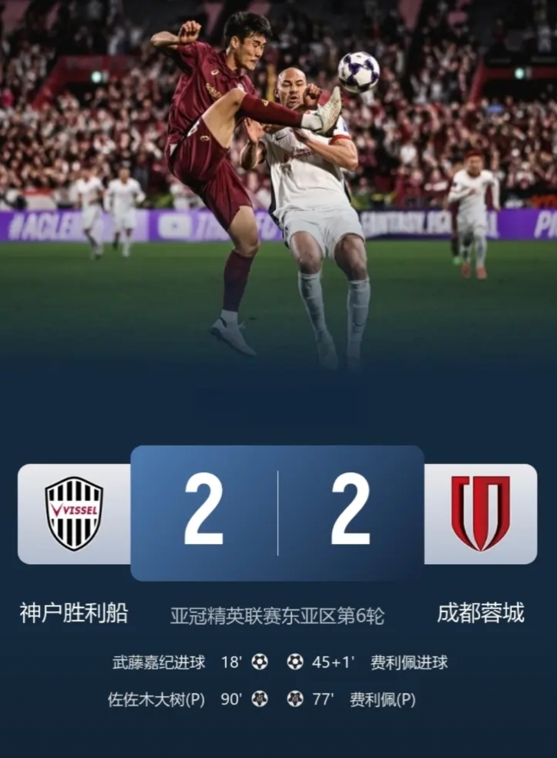 成都蓉城2-2战平神户胜利船,4轮亚冠不胜,但仍有机会出线!
