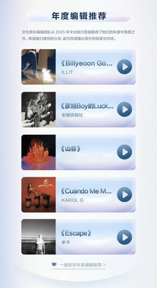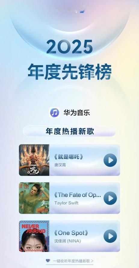 什么眼光能发现ILLIT和沉舟乐队啊?这份年度音乐榜单有品味! 时间过得太快,还没回过神,2025年居然就要翻篇了。每到年底,各大App的年度总结就像一场大型的“互联网回忆杀”,但今天刷到的这份华为音乐2025年度榜单,真的有戳中我。它不只是一堆冰冷的播放数据,更像是一份懂你的“声音记忆档案”! 当看到“年度编辑推荐”里出现了沉舟乐队的《山谷》和ILLIT的《Billyeoon Goyangei》,我必须要夸一句:编辑团队是有真品味的!这些歌真的陪我度过了好几个加班的深夜。 而更让我惊喜的是“年度空间音频热播单曲”榜单,强烈建议大家带上耳机去听听榜单里的《Letting Go》或王力宏的《天地龙鳞》。你会发现,原本熟悉的旋律变得完全不同了,声音不再是挤在耳边的“纸片感”,而是像在Live House现场一样,人声、乐器从四面八方包裹过来,那种临场感真的绝了。哪怕不是发烧友,也能一耳朵听出区别,这就是给耳膜做SPA的感觉吧! 除了流行热歌,更让我觉得华为音乐“走心”的,其实是这个“非遗音乐臻选集”,它来自藏在华为音乐音乐厅里的宝藏——非遗专区。以前觉得非遗离我们很远,但华为音乐真的做到了让传统文化“活”起来。 点开一首侗族大歌《撒网歌》,当我开启超高清音频,那层层叠叠的和声一下子变得清晰又立体,能听见领唱者嗓音中细微的颤动,也能感受到合唱时众人声音如山林回响般自然交融。没有复杂的编曲,每一处呼吸却都真实可触。这种用最前沿的科技去还原最古老声音的“反差感”,真的太有质感了,而且每首歌都能听超高清音频哦。 另外,如果你刚入手了天生HarmonyOS 6的华为Mate 80或者Mate X7系列,记得去负一屏“鸿蒙有礼”领6个月的Petal One悦享套餐权益,其中包含了华为音乐超钻会员,然后再去畅听这份年度榜单,给2025画个完美的句号! 鸿蒙2025年度先锋榜揭晓 晒晒你最常听的歌单