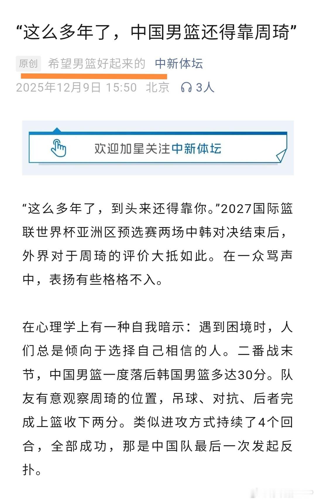 “这么多年了,中国男篮还得靠周琦”。中国新闻网旗下的“中新体坛”发表了一篇关于周琦的人物稿,该文称标题这句是在男篮世预赛连续负于韩国男篮后外界对周琦的评价。打开该文,作者署名差点笑喷,“希望男篮好起来的”。中国男篮对阵韩国两连败