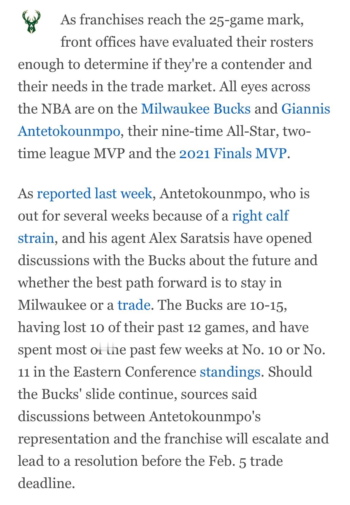 Shams:字母哥已与其经纪人萨拉齐斯一同,开启了与雄鹿队的未来规划谈判,探讨留队或是通过交易离队哪条才是最优出路。消息人士称,若雄鹿的颓势持续,字母哥团队与球队的谈判将进一步升级,并有望在2月5日的交易截止日前得出最终结果。赛季开打前,字母哥对球队阵容的担忧,以及他想要探寻其他可能性的想法——他曾表示,若离开雄鹿,自己希望加盟纽约尼克斯——促使雄鹿与尼克斯在8月展开了长达数周的谈判。消息人士透露,尼克斯方面曾提交过报价方案,但双方并未取得实质性进展,最终雄鹿与字母哥决定暂时搁置分歧,继续携手征战新赛季。消息人士称,若雄鹿方面愿意与其他球队商讨关于字母哥的交易,那么尼克斯将不再拥有作为其首选下家的独家谈判权。从合同情况来看,字母哥的现有合同保障期至2026-2027赛季结束,2027-2028赛季拥有球员选项,这让他在未来去向的问题上握有极大的话语权。联盟高管们认为,NBA的新版土豪线规则,再加上他的顶薪合同以及即将到来的超级顶薪续约资格,会让这笔潜在交易的难度大大增加,并且要求他必须向交易下家明确表达长期留队的意愿。这也意味着,他将完全掌控自己的未来。