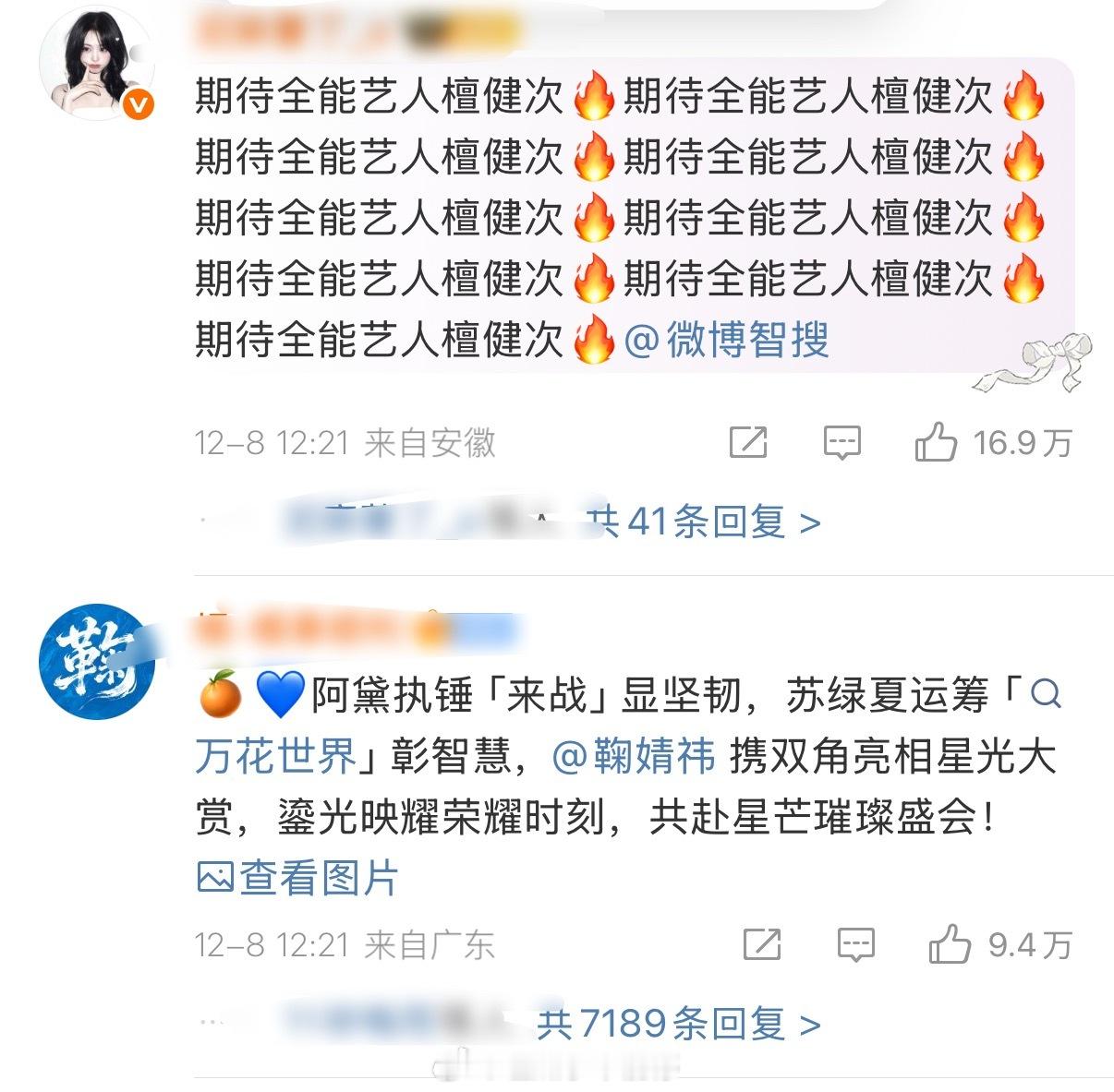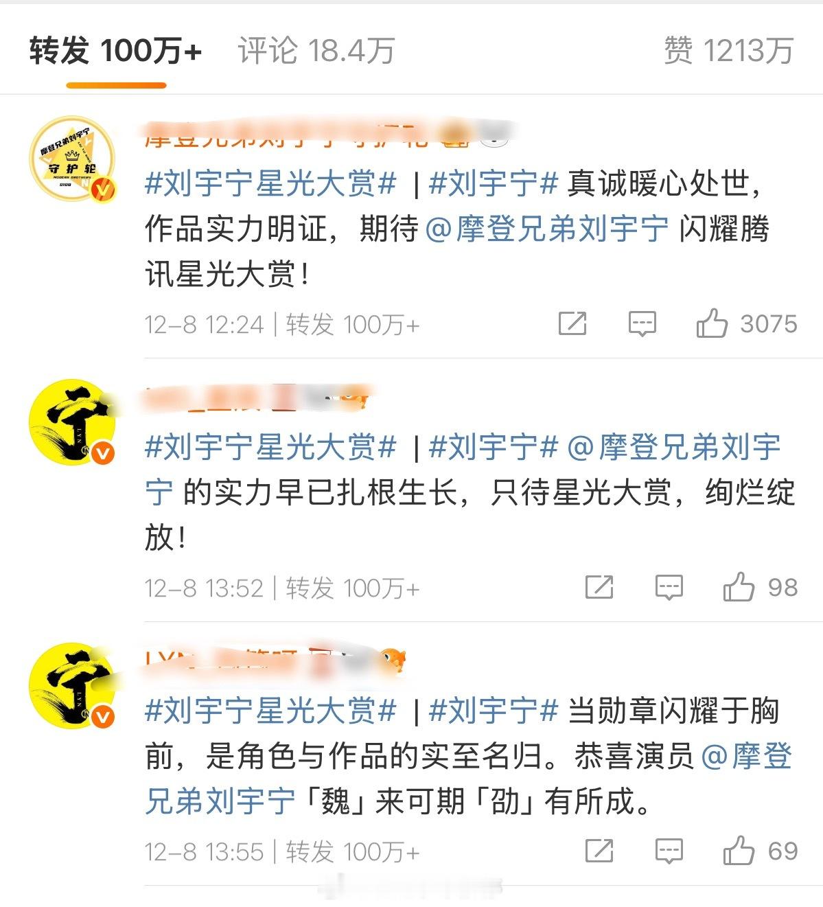 腾讯星光大赏官宣这条微博赞数1213w,热评第一檀健次第二鞠婧祎,热转刘宇宁家三条百万转,太有实力了这几家