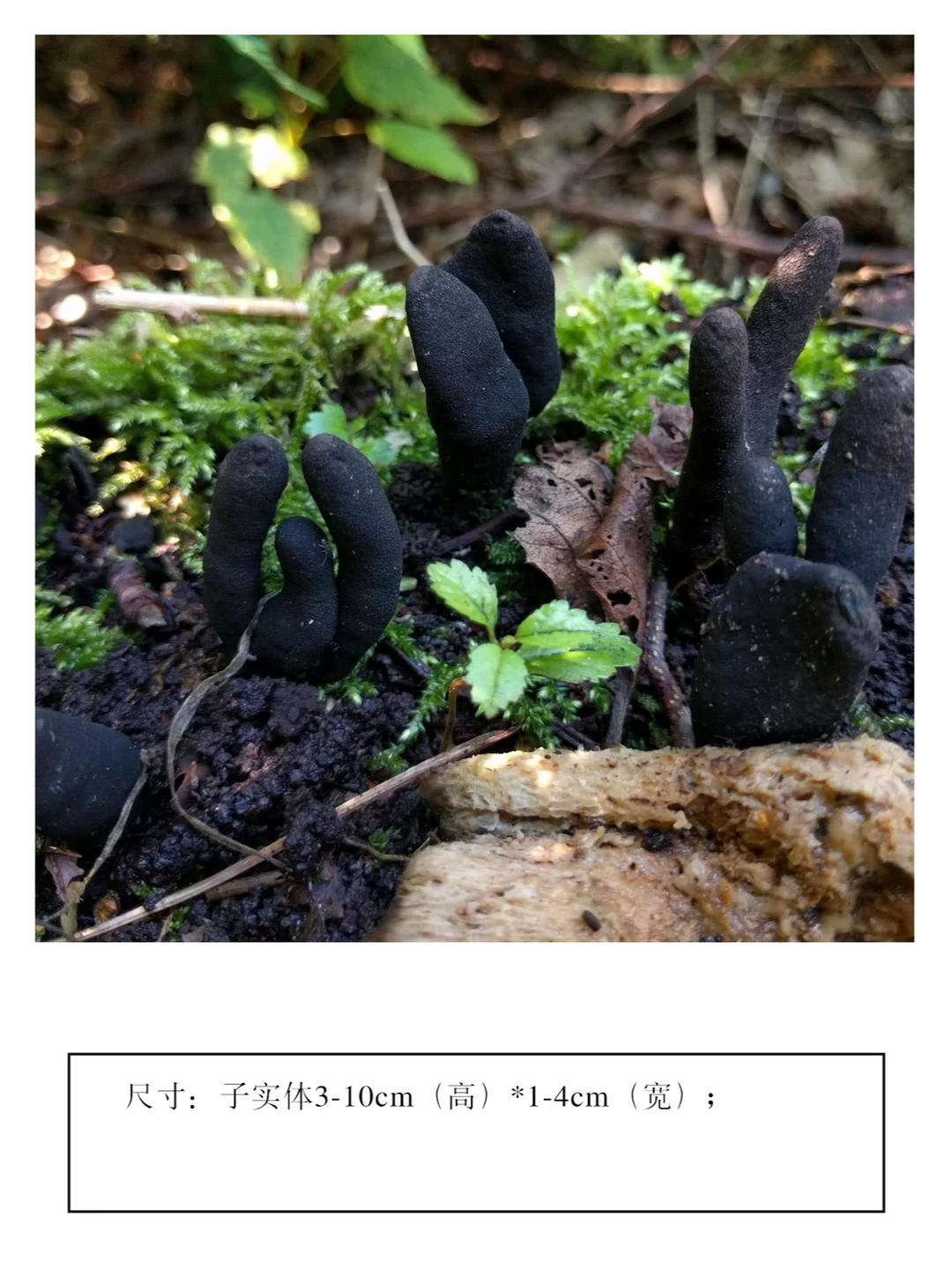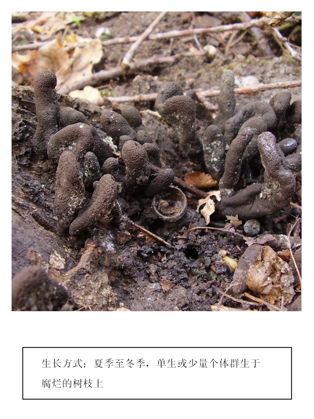 菌盖:子座一般中等,单生或几个在基部连在一起,干时质地较硬,上部呈棒形、圆柱形、椭圆形、亚铃形、近球形或扁曲,高3-12cm,粗0.5-2.2cm,内部肉色,表皮多皱,暗色或黑褐色至黑色。