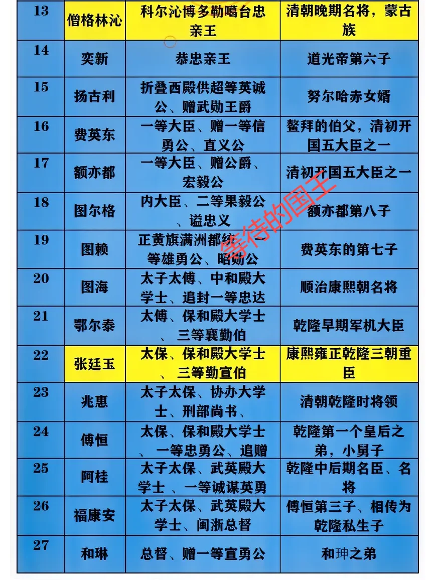 如图所示,清朝27位配享太庙的大臣。他们之中有皇亲,也有国戚,还有三朝元老……他们都在大清的各个历史阶段,为清朝建国,开疆拓土,稳定朝局等作出了巨大贡献。值得一提的是在大清历史上,一共出现了三位“常务副皇帝”,一位是多尔衮,他作为摄政王,权力已经超过了“副皇帝”,甚至可以说是“代皇帝”。而真正意义上的“常委副皇帝”就是胤祥,他当时是集军政财权于一身,为雍正王朝的稳定起到了至关重要的作用。另外还有一位议政王奕訢,其实他的能力比咸丰更强,只不过他没有遇到像康熙这种圣明的爸爸,最后道光把皇位传给了更重孝道的咸丰,不过奕訢也曾代理皇帝留守北京,还曾在咸丰去世后权倾朝野,所以说他是“常务副皇帝”也不为过。