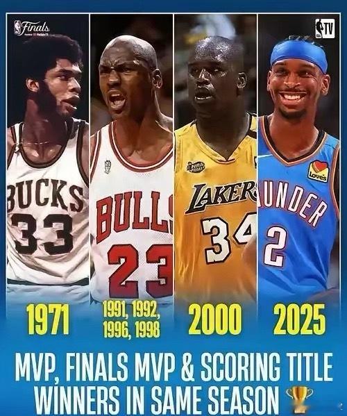 【近半神与神】赛季全满贯的球员仅4人:4、亚历山大1次,24/25赛季,拿到得分王+MVP+总冠军+FMVP【近半神】3、奥尼尔1次,99/00赛季,拿到得分王+MVP+总冠军+FMVP。【近半神】2、贾巴尔1次,70/71赛季,拿到得分王+MVP+总冠军+FMVP。【半神】1、乔丹4次,90/91赛季+91/92赛季+95/96赛季+97/98赛季,都拿到得分王+MVP+总冠军+FMVP。【神】