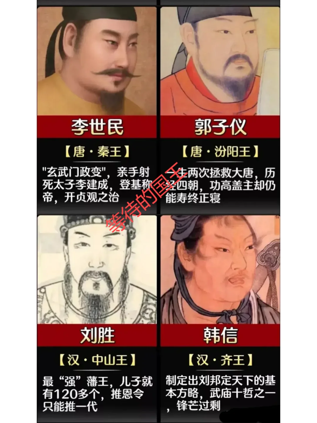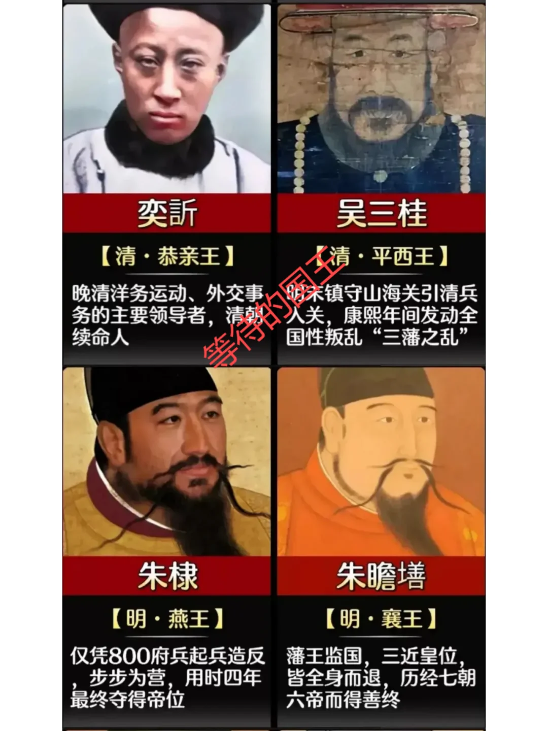 秦 王李世民:当皇帝了。 燕 王朱 棣:当皇帝了。 平西王吴三桂:当皇帝了。 如图所示,我国历史上最强的“十大王爷”简介一览图。其中有7个本姓王,3个外姓王。他们之中有的凌驾于皇帝之上,有的与皇帝平起平坐,还有的直接当了皇帝……总体来看,凌驾于皇帝之上的,又或是皇帝觉得你有威胁的,还有的想自立为王的,下场都非常惨。他们的故事也就告诉我们现在正在职场工作的人一个道理,要么你有能力脱离单干,要么你就尊重领导,规规矩矩干好本职工作,千万不要有点能力就盲目自大,否则后悔莫及。