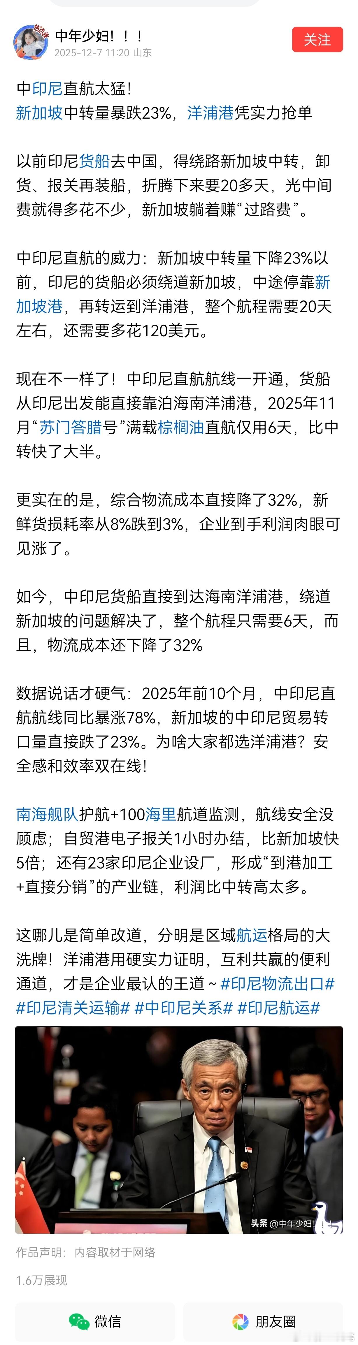 中印尼直航非常棒,新加坡中转量暴跌23%,洋浦港凭实力抢单!黄循财还站日本高市早苗么?后续加大北极航线拓展,减少路过新加坡。以前印尼货船去中国,得绕路新加坡中转,卸货、报关再装船,折腾下来要20多天,光中间费就得多花不少,每个货柜还需要多花120美元,新加坡躺着赚“过路费”。现在不一样了!中印尼直航航线一开通,货船从印尼出发能直接靠泊海南洋浦港,2025年11月“苏门答腊号”满载棕榈油直航仅用6天,比中转快了大半。