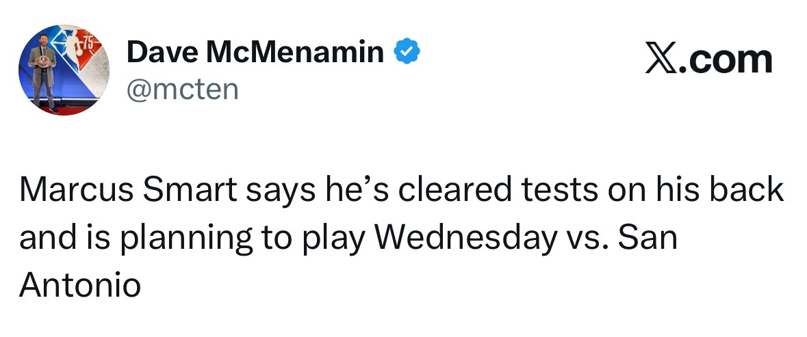 斯马特表示,他的背部检查结果呈阴性,计划参加对阵马刺的比赛。