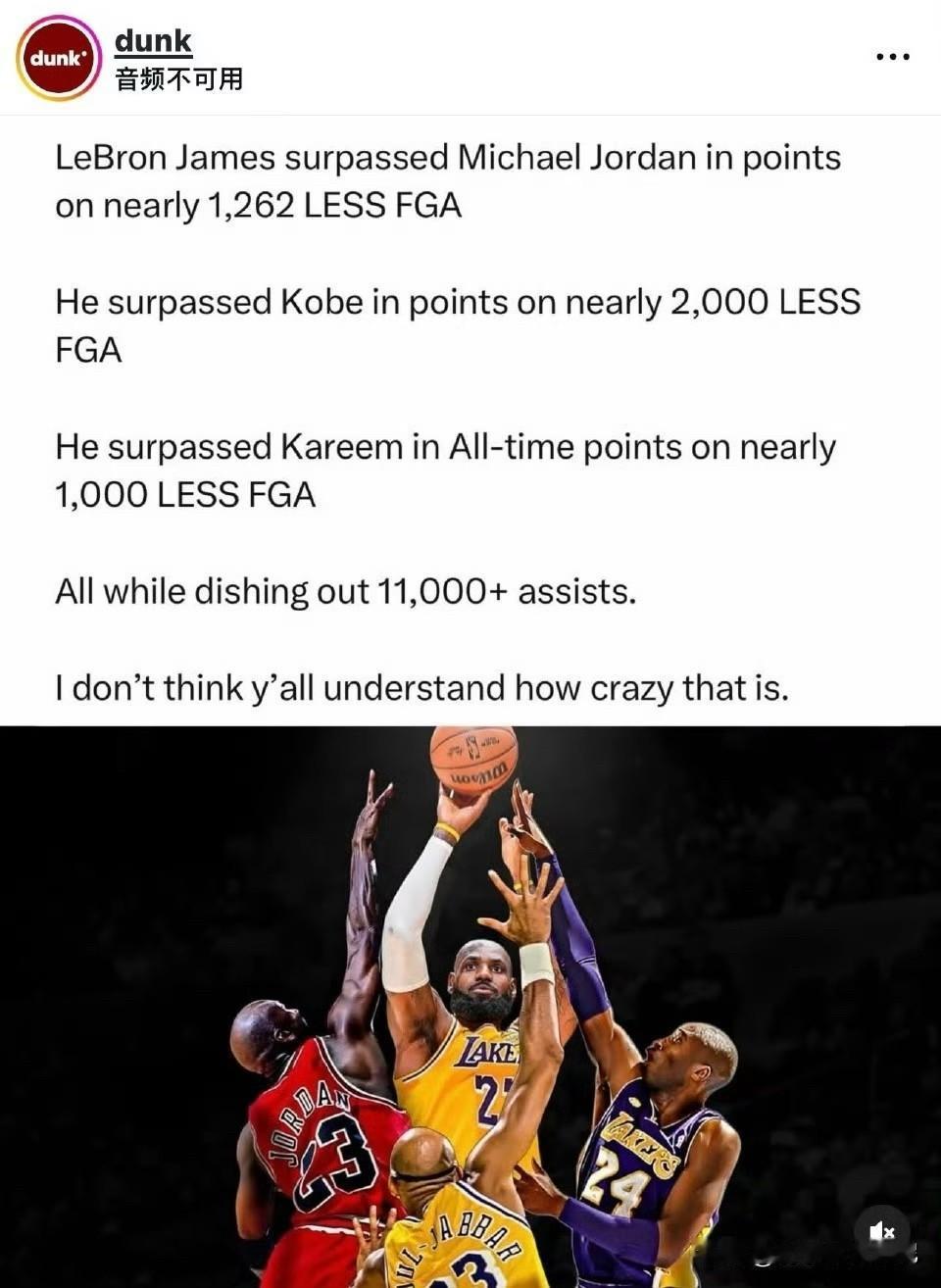 美媒DUNK发推列数据夸奖詹姆斯: 总得分超乔丹时,比乔丹少了将近1262次投篮出手; 总得分超科比时,比科比少了将近2000次投篮出手; 总得分超贾巴尔时,比贾巴尔少了将近1000次投篮出手。 关键是詹姆斯还送出了11000次助攻,我不认为你们了解这有多疯狂。 球迷回复1:詹姆斯得分这么厉害,得分王应该不少吧?10个?15个?还是20个? 球迷回复2:詹姆斯统治力、得分效率这么高?应该拿了很多冠军吧? 球迷回复3:又一项勒布朗的专属定制数据吗? ……. [吃瓜群众][吃瓜群众]