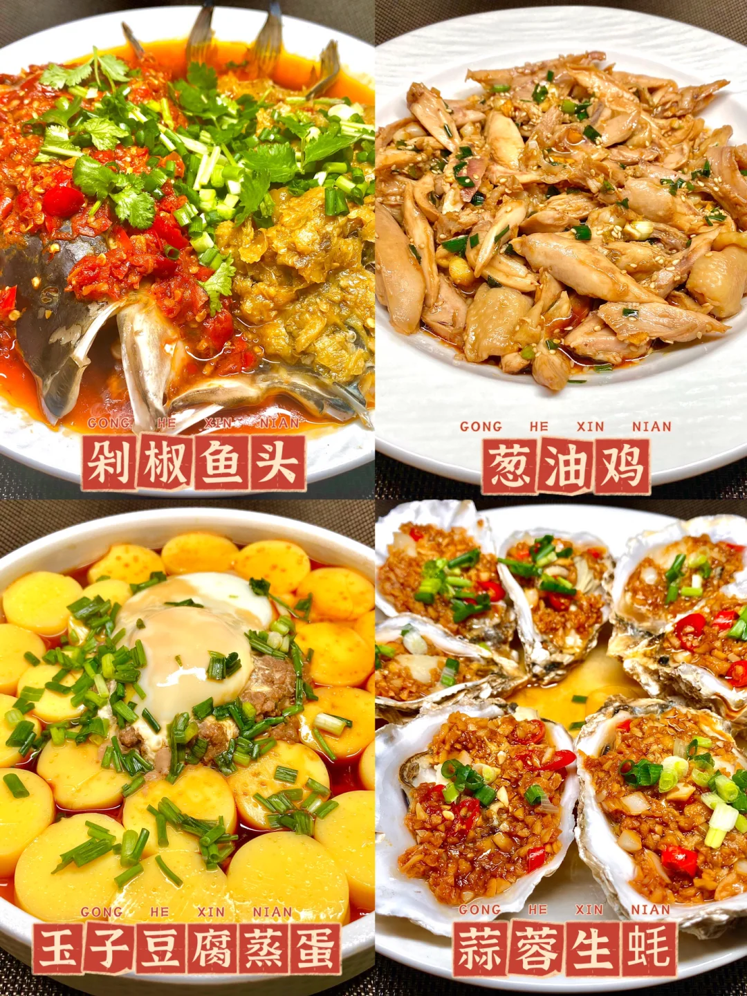 今天晚餐长这样 笔记灵感 分享下饭家常菜教程 具体做法往后翻,每道菜都有详细的教程介绍 春节临近,因为要回家和男朋友提前吃了顿年夜饭 明天开始要更新年夜饭的菜谱推荐啦~ 希望对小伙伴们有所帮助[大笑R][大笑R] 今日菜单: [烟花R]剁椒鱼头 [烟花R]葱油鸡 [烟花R]玉子豆腐蒸蛋 [烟花R]蒜蓉生蚝 [烟花R]爆炒小油菜 [烟花R]水果拼盘