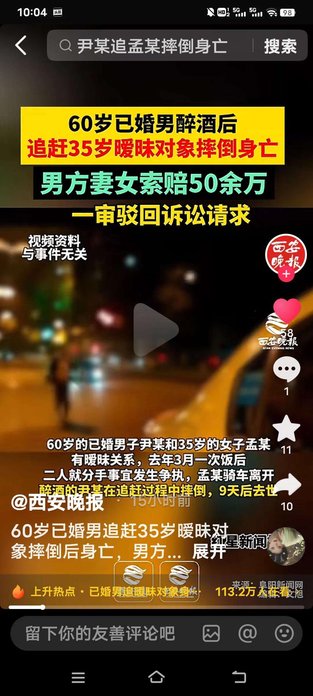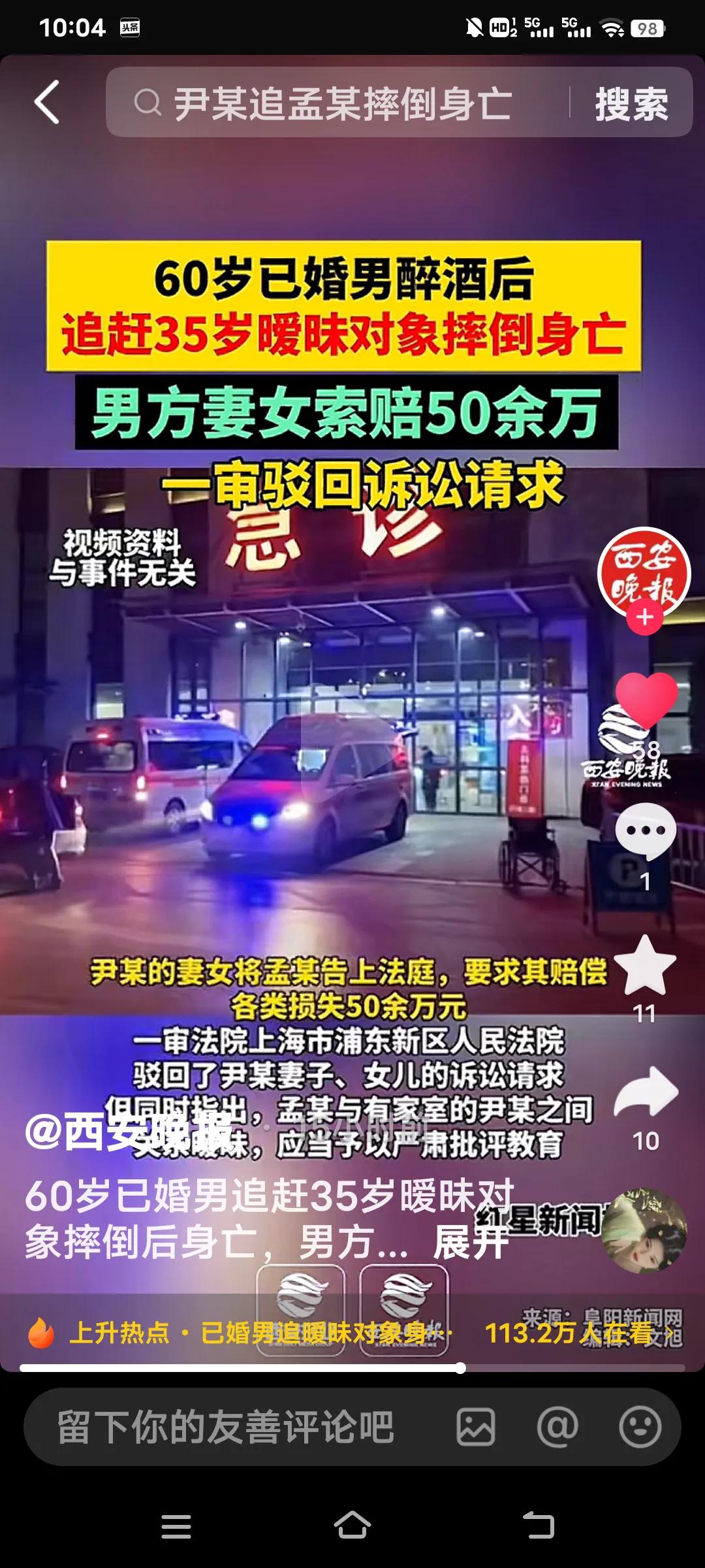 60岁已婚男追赶35岁暧昧对象摔倒身亡,男方妻女索赔这事太离谱。2024年3月31日,上海浦东60岁尹某和35岁孟某饭后因分手争执,孟某骑车离开,醉酒的尹某追赶摔倒,9天后去世。尹某妻女索赔60余万,称孟某没护送醉酒的尹某回家,还放任他追赶。 但一审法院驳回诉求,指出尹某妻女没证明孟某有违法行为、主观过错,也没证明死亡和孟某行为有因果关系。尹某作为成年人,本就该对自身安危负责。这尹某婚内暧昧不对,其家属索赔也无理取闹。 这样的事情已经不是一例了,说到底都不应该这么做,何必呢?尤其是女子,这下又名声大噪了吧,正道走,走邪道。“摔了一跤”就知道啥是真,善,美,啥是假货,丑,恶了吧!婚内致死案 大爷摔伤致死 醉酒坠亡案