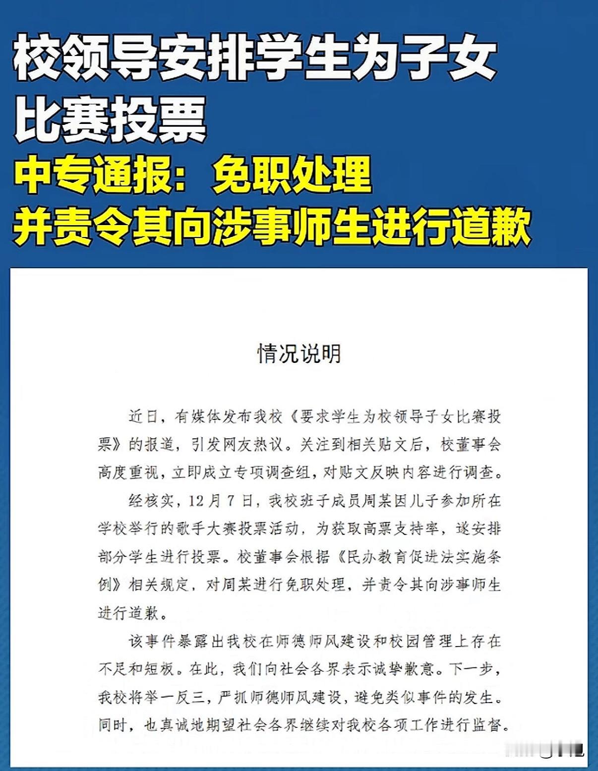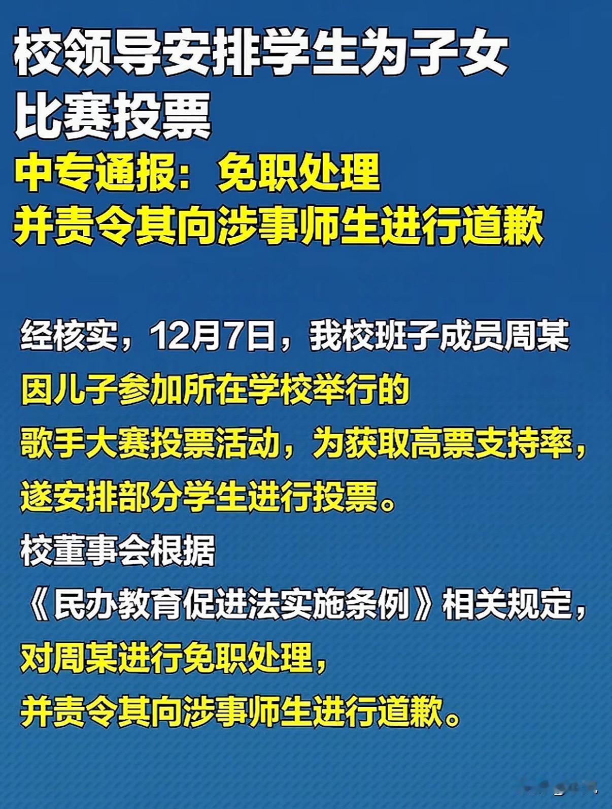 郑州电力中等专业学校有个班群,12月7日突然收到班主任通知。通知说,这是“领导交代的重要任务”,要大家给一个叫“周海鹏”的学生投票。要求很具体:“看见‘周海鹏’三字就投票”,还催着“有平台的都发布,赶快动起来”。 后来大家才知道,周海鹏是学校一位班子成员周某的儿子,正在参加浙江某高校的“十佳歌手大赛”网络投票。这不止是发个链接那么简单,部分学生被要求早上六点半就到现场集中投票。 有个男生觉得不对劲,把群聊截图曝光到了网上。这下可捅了马蜂窝。班主任立刻私信找他,话里话外让他把视频删了。男生没同意,还说了句:“不敢返校了。”这话里的担心,明眼人都懂。 事情闹大了,学校先说要“核实”,又说这是下属中专的事,有点推来推去。到了12月10日,处理通报来了:对周某免职,责令道歉,承认学校师德师风有问题。 通报里没提怎么保护那个举报的学生。他以后在学校会怎么样,成了大家心里的一个问号。 再看那个比赛,周海鹏最终拿到了“最佳人气奖”,得票率23.24%。投票时间线和那道强制投票指令高度重合,这个奖杯的成色,难免让人多看两眼。 一道投票指令,掀开的不仅是滥用职权这么简单。班级群本是为了学习交流,什么时候成了完成“私人任务”的地方?当“重要任务”压下来,那些不想投票、不敢反抗的学生,他们的意愿被放在哪里? 那个勇敢曝光的学生,他面临的潜在压力是真实的。学校最后的通报,只处理了发出指令的人,却没有明确给举报者一个安全保障。这种沉默,恰恰是很多人最担心的地方。 学校是教书育人的地方,权力用错了方向,教给学生的会是什么呢?这件事看似是拉票,实际是权力越了界。把公共资源用于私人目的,让学生们身处一种不对等的关系里,被迫配合。 风波会过去,但留下的问题需要回答。如何确保学生不必为说真话而害怕,如何让权力待在笼子里,才是一所真正学校该有的样子。