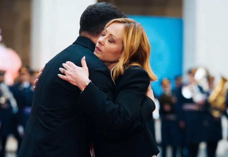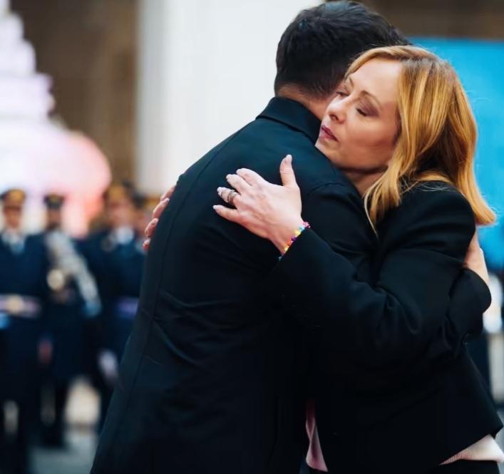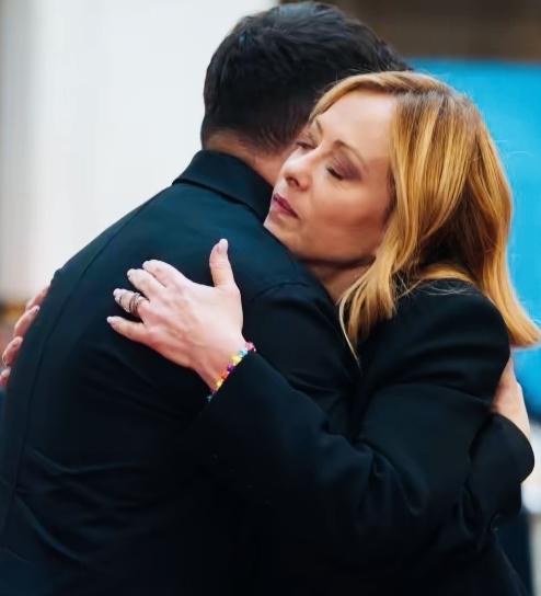 梅洛尼闭着眼在思考什么呢? 梅洛尼和泽连斯基见面时,热情相拥啊! 泽连斯基又体会