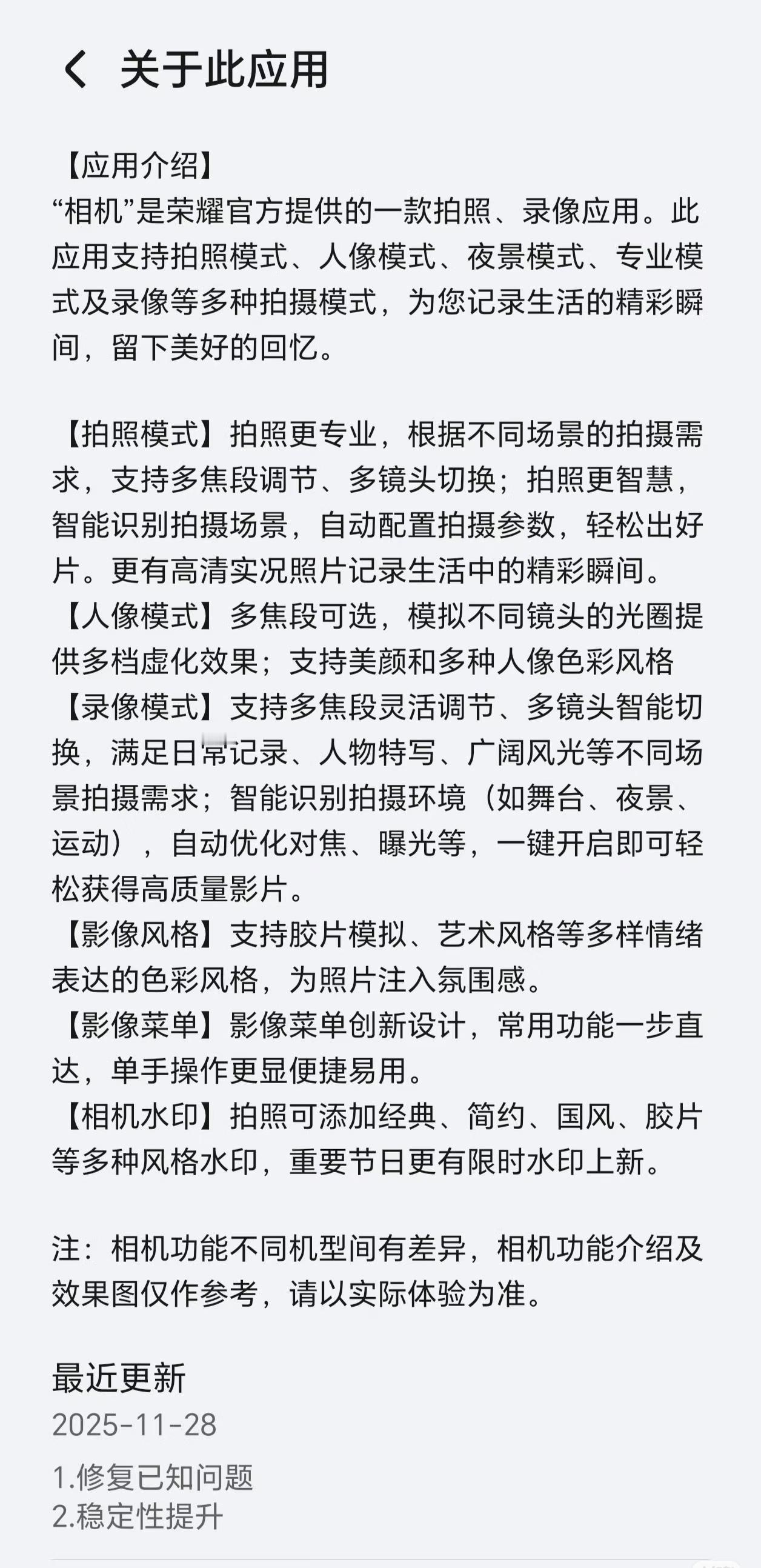 荣耀相机 App 已与系统解耦,不再捆绑整机更新,可谓一次明晃晃的“阳谋”。 荣耀 Magic8 系列的相机 App 实现独立升级,不再受系统更新节奏束缚。过去必须等待系统整体更新才能优化相关算法,确实有些迟缓,消费者也难以直观感受荣耀影像是否取得进步。解耦后,只需在应用市场搜索“相机”即可获取独立更新,相比以往必须等待完整系统更新,如今更加高效。影像工程师们正全力推进,力争让更多机型享受这一独立更新机制