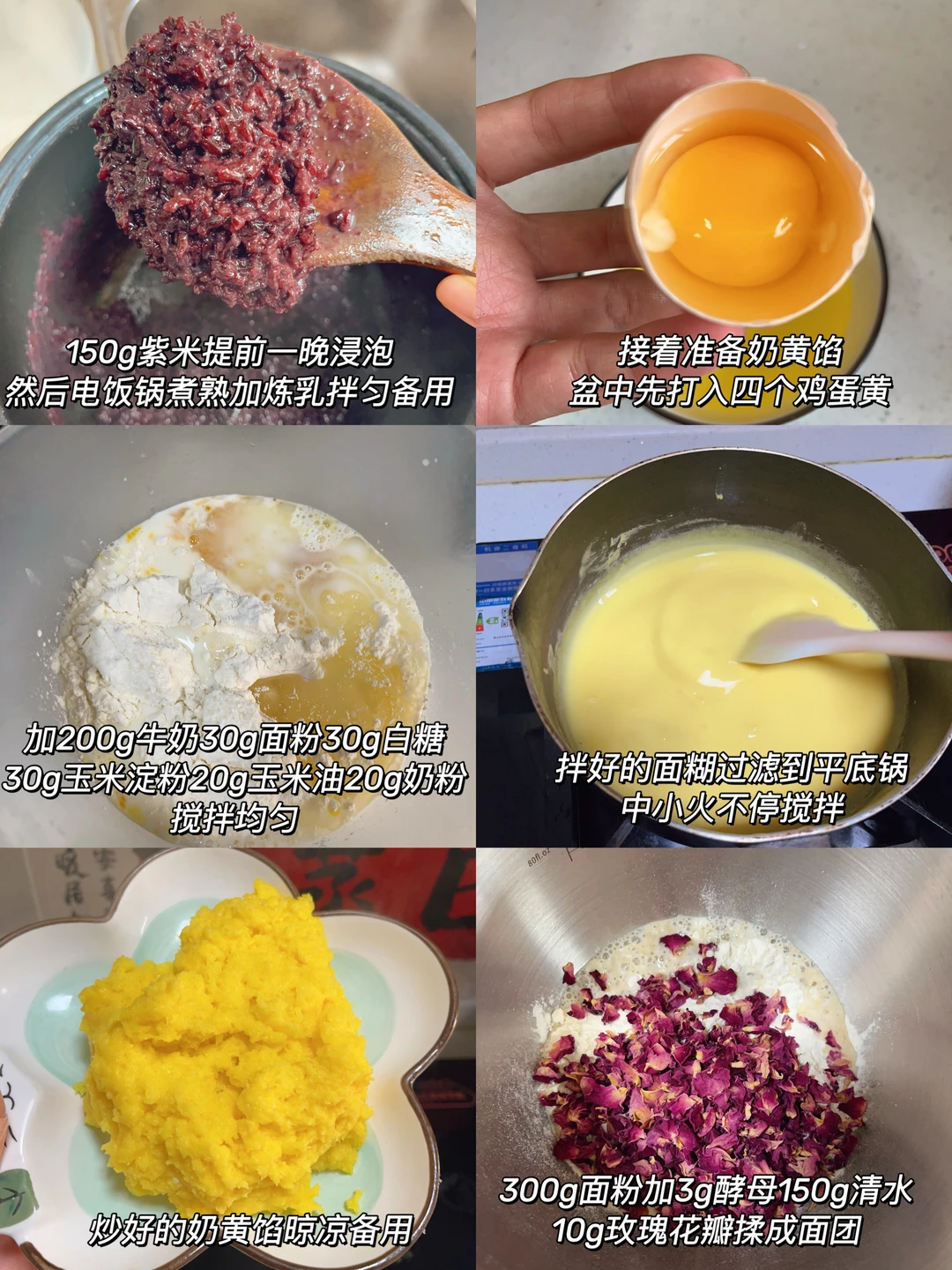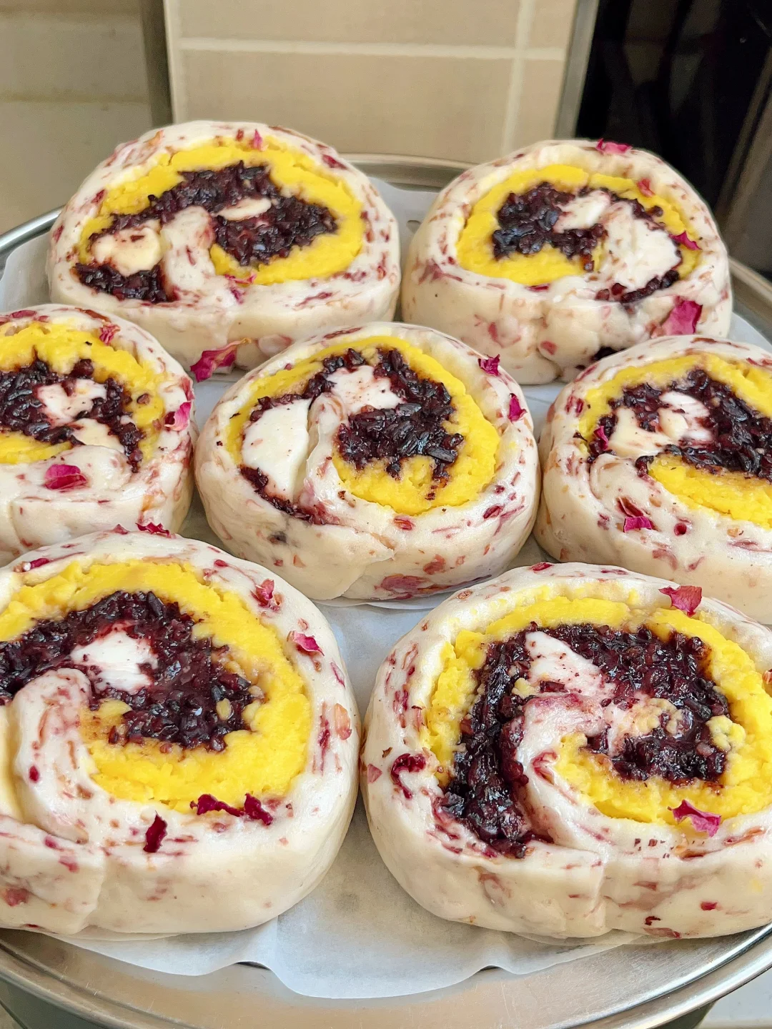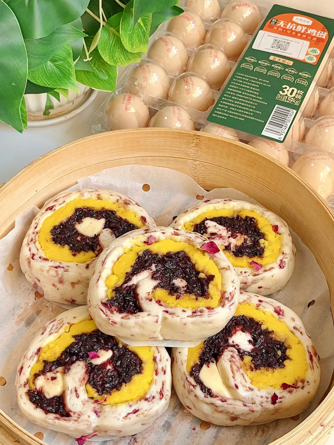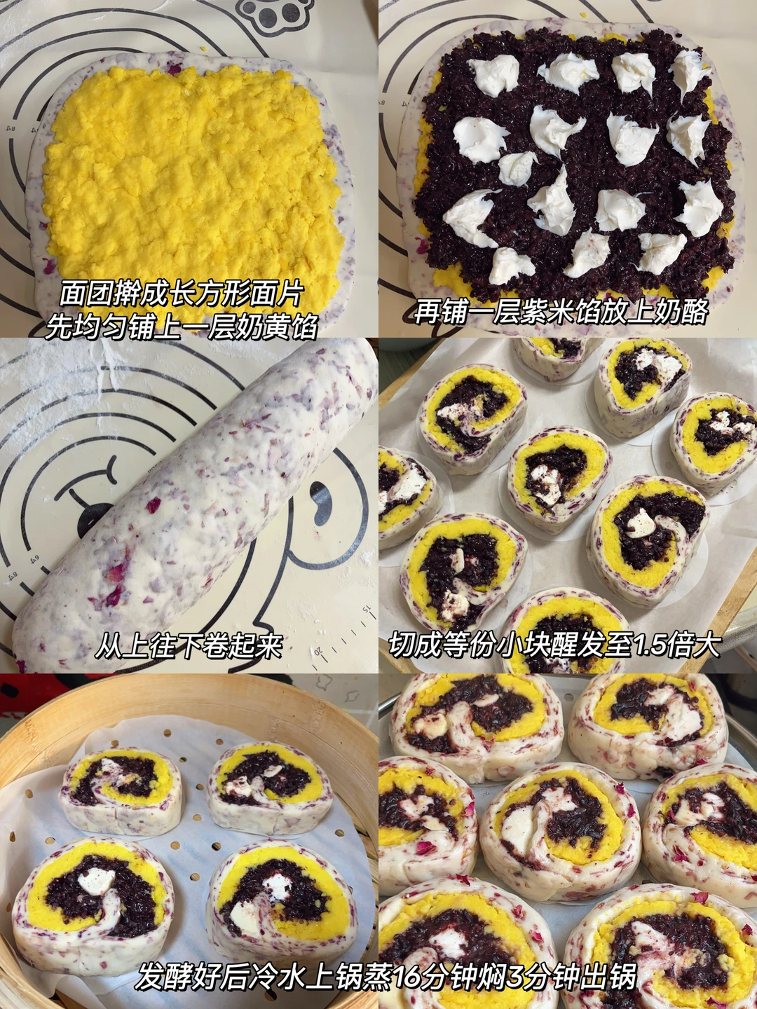 一定要试试这个玫瑰紫米奶黄奶酪馒头卷,把做面包的心思都用在做馒头上了能不好吃吗,真的又香又糯又香甜,连吃五天都不带腻的 食材: 紫米馅:紫米 糯米 奶粉 炼乳 奶黄馅:蛋黄 牛奶 玉米淀粉 面粉 奶粉 玉米油 白糖 面团:面粉 酵母 清水 玫瑰花瓣 奶酪 步骤: 1.紫米和糯米提前一晚浸泡,然后电饭煲煮熟加奶粉或者炼乳拌匀备用 2然后准备奶黄馅,奶黄馅所有食材倒入盆中拌匀,然后过筛一次倒入锅中,中小火不停搅拌至成团,捞出晾凉备用 3面粉加酵母清水玫瑰花瓣揉成面团,擀成长方形面片,铺上紫米馅和奶黄馅,在放上奶酪,从上往下卷起来,切成等份小段 4切好的馒头卷醒发至1.5倍大,开火蒸15分钟焖3分钟 超级无敌好吃的,做奶黄馅用到的鸡蛋是永辉定制精选无抗鲜鸡蛋,我也算是永辉超市的常客了,平时的生活日用品都会在永辉选购,选择这款鸡蛋也是我经常购买的,它是可生食级别的鸡蛋,所以品质上完全可以放心,无抗生素买的放心吃的安心,平时给孩子做奶黄馅的馒头或者做辅食都会用到这款鸡蛋