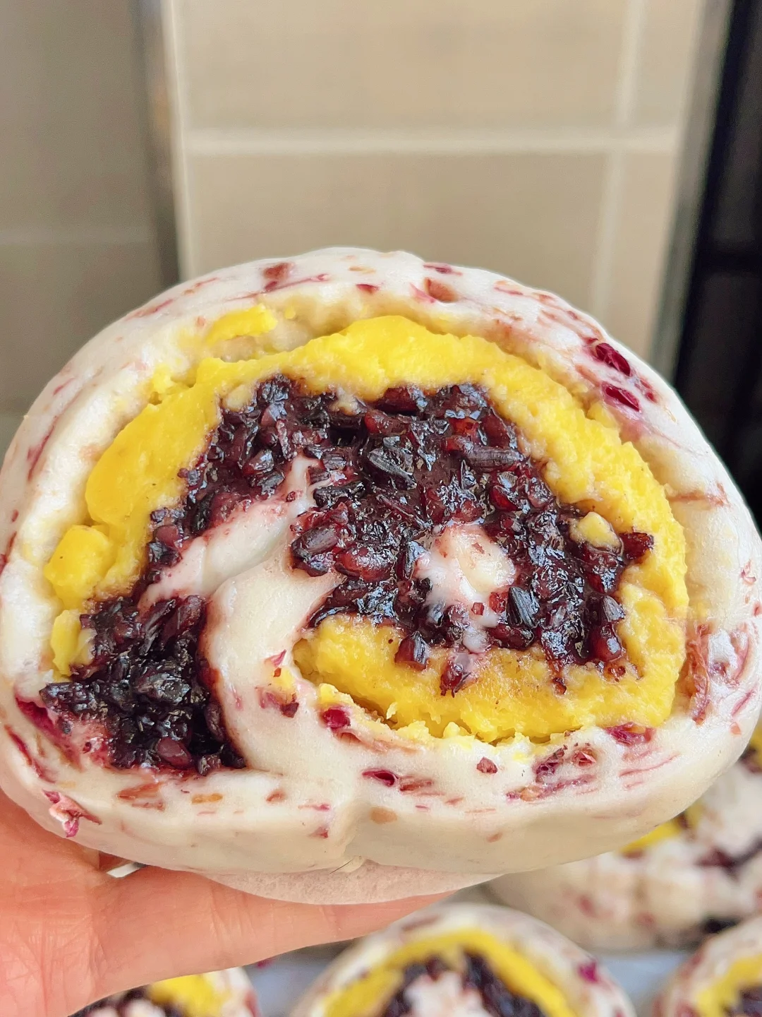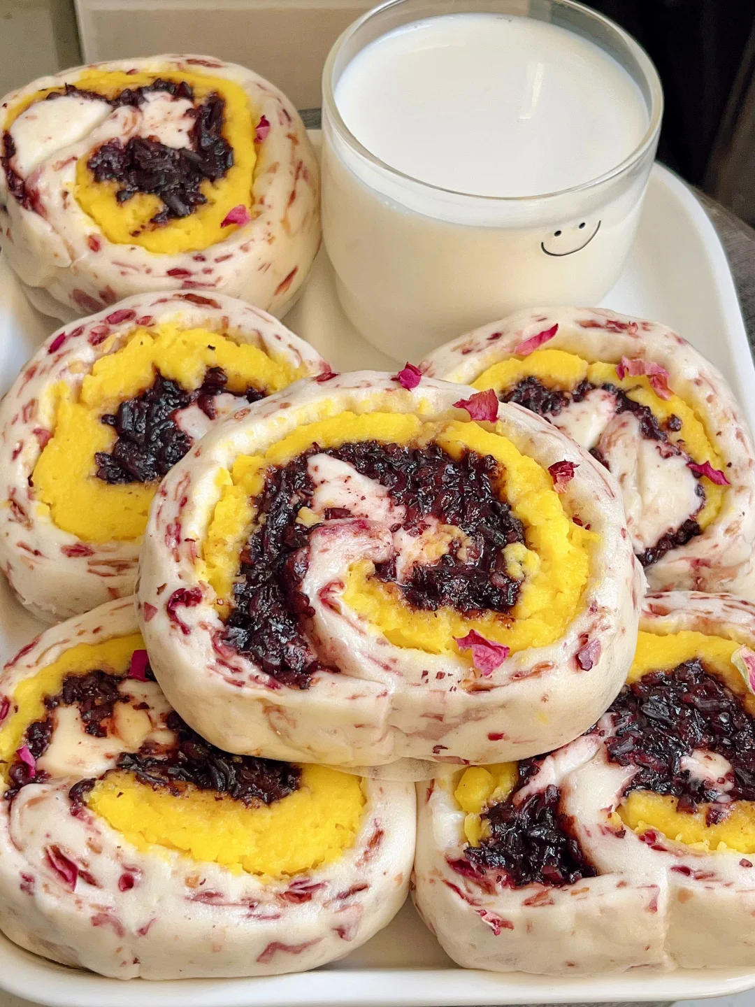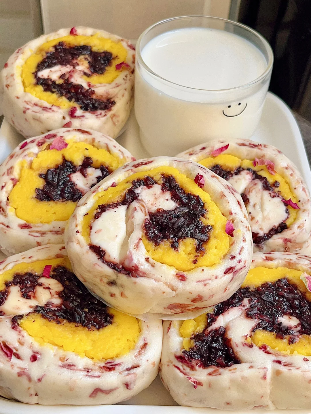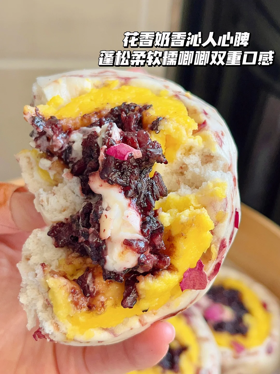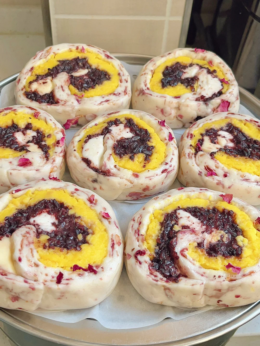 一定要试试这个玫瑰紫米奶黄奶酪馒头卷,把做面包的心思都用在做馒头上了能不好吃吗,真的又香又糯又香甜,连吃五天都不带腻的 食材: 紫米馅:紫米 糯米 奶粉 炼乳 奶黄馅:蛋黄 牛奶 玉米淀粉 面粉 奶粉 玉米油 白糖 面团:面粉 酵母 清水 玫瑰花瓣 奶酪 步骤: 1.紫米和糯米提前一晚浸泡,然后电饭煲煮熟加奶粉或者炼乳拌匀备用 2然后准备奶黄馅,奶黄馅所有食材倒入盆中拌匀,然后过筛一次倒入锅中,中小火不停搅拌至成团,捞出晾凉备用 3面粉加酵母清水玫瑰花瓣揉成面团,擀成长方形面片,铺上紫米馅和奶黄馅,在放上奶酪,从上往下卷起来,切成等份小段 4切好的馒头卷醒发至1.5倍大,开火蒸15分钟焖3分钟 超级无敌好吃的,做奶黄馅用到的鸡蛋是永辉定制精选无抗鲜鸡蛋,我也算是永辉超市的常客了,平时的生活日用品都会在永辉选购,选择这款鸡蛋也是我经常购买的,它是可生食级别的鸡蛋,所以品质上完全可以放心,无抗生素买的放心吃的安心,平时给孩子做奶黄馅的馒头或者做辅食都会用到这款鸡蛋