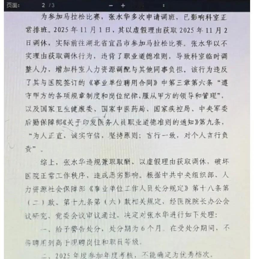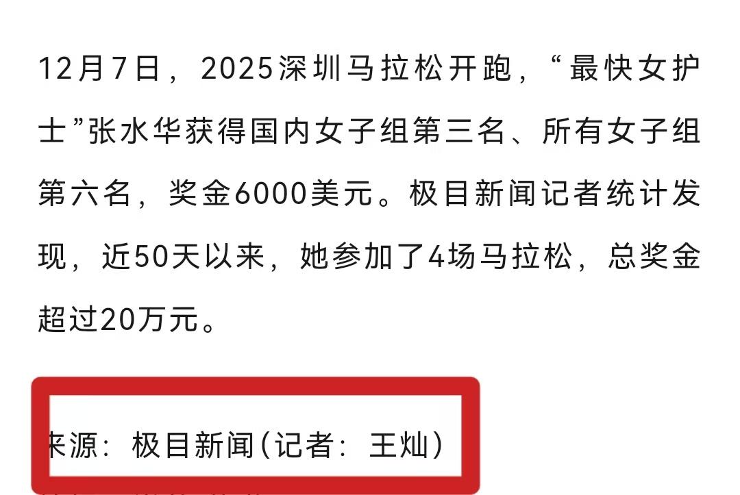 还记得8月份那个在镜头前哭得梨花带雨,喊话单位“多支持”的“最快护士”张水华吗? 当时还有不少人心疼她,骂医院死板。结果回旋镖很快就来了! 近日医院对她的通报出来了,这哪里是“为了梦想”,分明是“为了捞金”把单位当猴耍啊! 看看媒体扒出来的数据:短短50天,她跑了4场马,光比赛奖金就进了账20多万! 这还不算她私底下违规接的品牌代言费。20万啊,普通护士得熬多少个大夜班才能赚回来? 想赚钱没毛病,但你不能撒谎啊!通报里说得明明白白,她为了去跑宜昌马拉松,直接编了个假理由请调休。 这事儿最恶心的地方在哪?在于她“坑同事”。医院那是啥地方?一个萝卜一个坑。她撒谎跑出去赚美金、听掌声了,她留下的活儿谁干?还不是科室里那些老实巴交的同事替她顶雷、替她负重前行! 既舍不得体制内的铁饭碗,又放不下外面的赚快钱,吃相真的太难看了。这一波,绝大多数人都站医院,还有网友在评论区打出了“大快人心”四个字。 其实大家的心情不难理解,大家都是打工人,谁愿意惯着这种“精致利己”的毛病?你们觉得呢?这处分冤不冤?