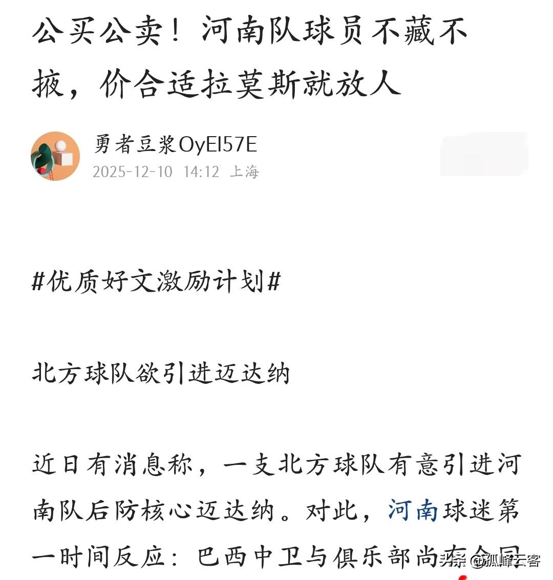 迈达纳要被交易离队,这可是一条炸裂性的消息! 赛季结束正是各种消息满天飞的时候,然而此时却有一位体育博主爆料“一支北方球队有意引进河南队中后卫迈达纳”让人始料未及,要知道这位巴西外援上赛季刚刚与球队完成续约,如果强行挖走可是需要付一笔价格不菲的“转会费”,谁会这么财大气粗敢如此操盘? 虽然在报道中言辞凿凿称只要价格合适河南队就会放人,不过在小编看来与其处心积虑挖走迈达纳,还不如将目标所马亚,后者本赛季结束合同即将恢复自由身,其作用和能力丝毫不逊于迈达纳,如果大费周折还要付出转会费的代价,还不如直接拿目标锁马亚岂不更加合适? 因此对于这个可能是杜撰的消息,小编以为并不可信,可以只当是笑谈而已![作揖][作揖][作揖]