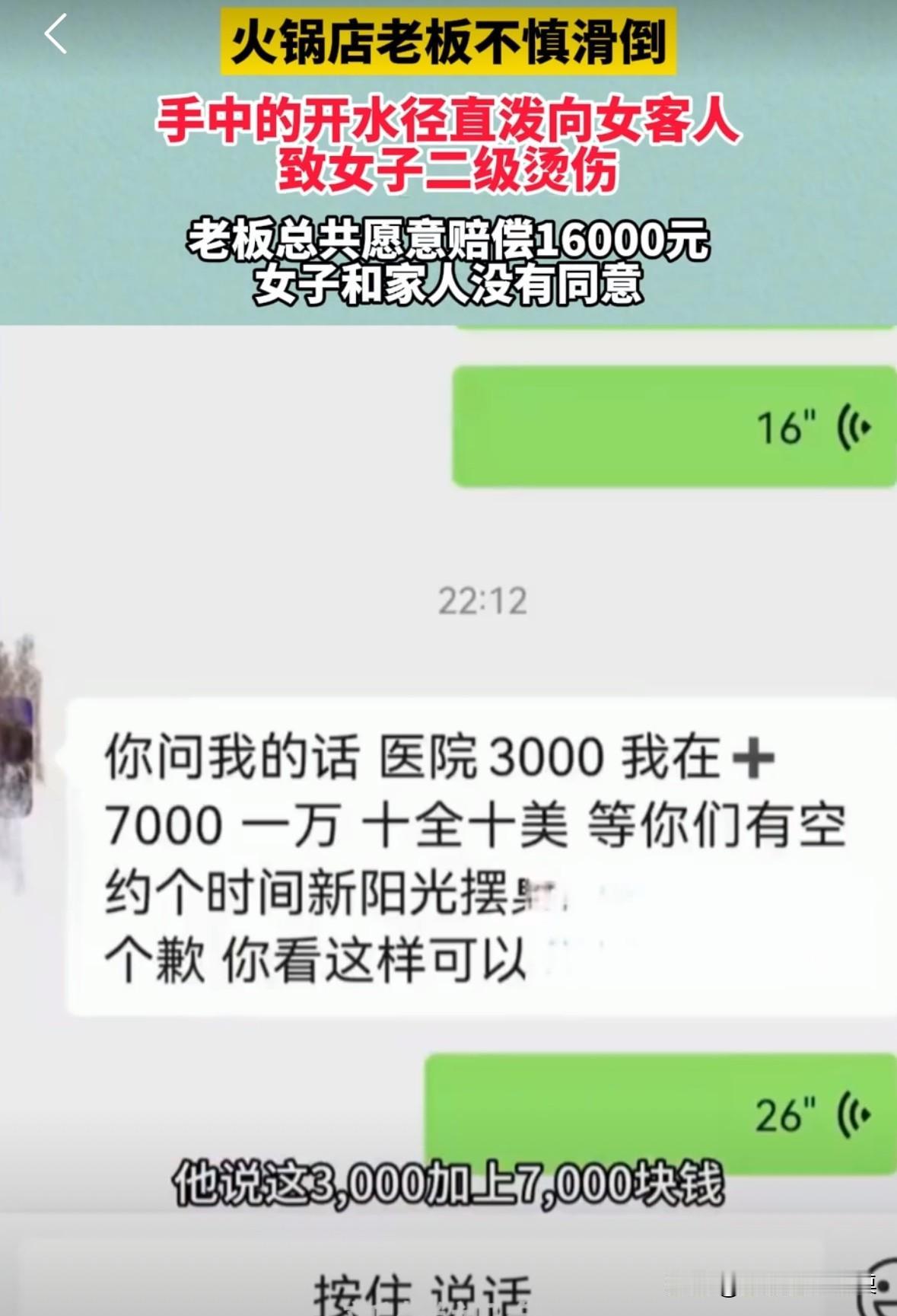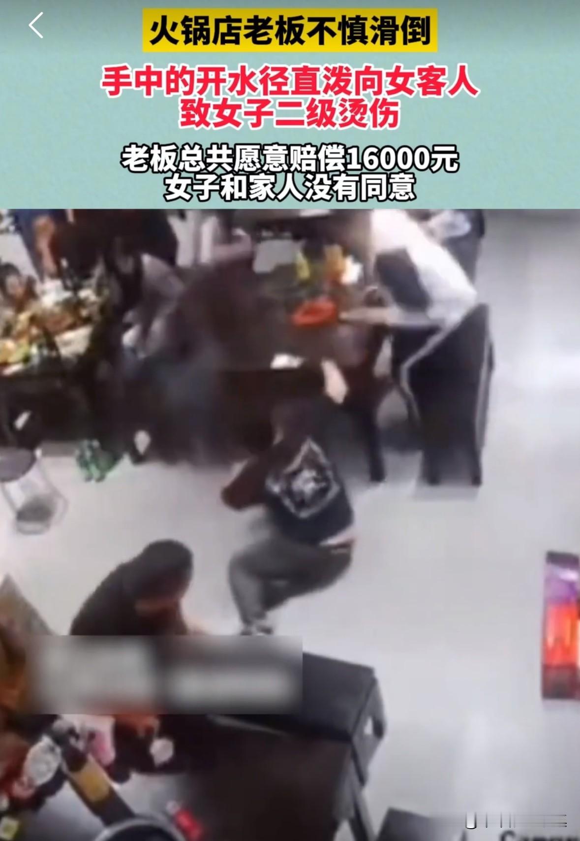 女子去火锅店吃火锅,火锅店老板不小心滑倒,手中滚烫的热水直直的泼向女顾客,女子当场被烫的大叫。 女子小臂上瞬间起了很多大水泡。 老板带女子去医院检查,经检查,属于二级烫伤。 老板给女子付了3000元医药费后,又给女子说:“我再赔付你7000块钱,一共一万,十全十美,等有时间了再给你摆一桌,道个歉。” 女子说不同意这个解决方案。 老板一周后又说,可以赔偿16000。 女子还是没有同意,并声明如果协商不了,就走法律途径。 我觉得这老板就是想敷衍了事,16000前期的治疗费用都不够。 再加上误工费,还有后期保养费,如果后期再留疤,没有十万块肯定不行的。火锅店意外事件