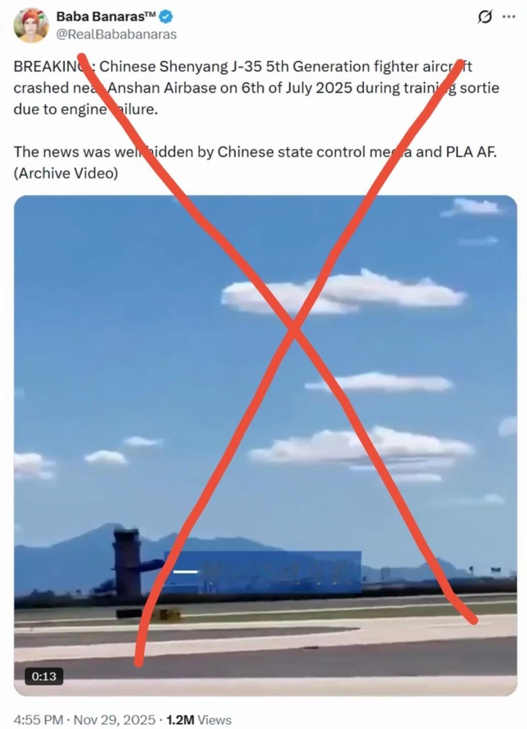 军号辟谣:近期,海外社交平台流传一则不实视频,声称 2025 年 7 月一架歼 - 35 战斗机在鞍山附近执行飞行任务时,因发动机故障坠毁。经核查,视频中的飞机实为美军 F-35 战斗机,拍摄地为美国戴维斯蒙森空军基地。此传言完全无中生有。