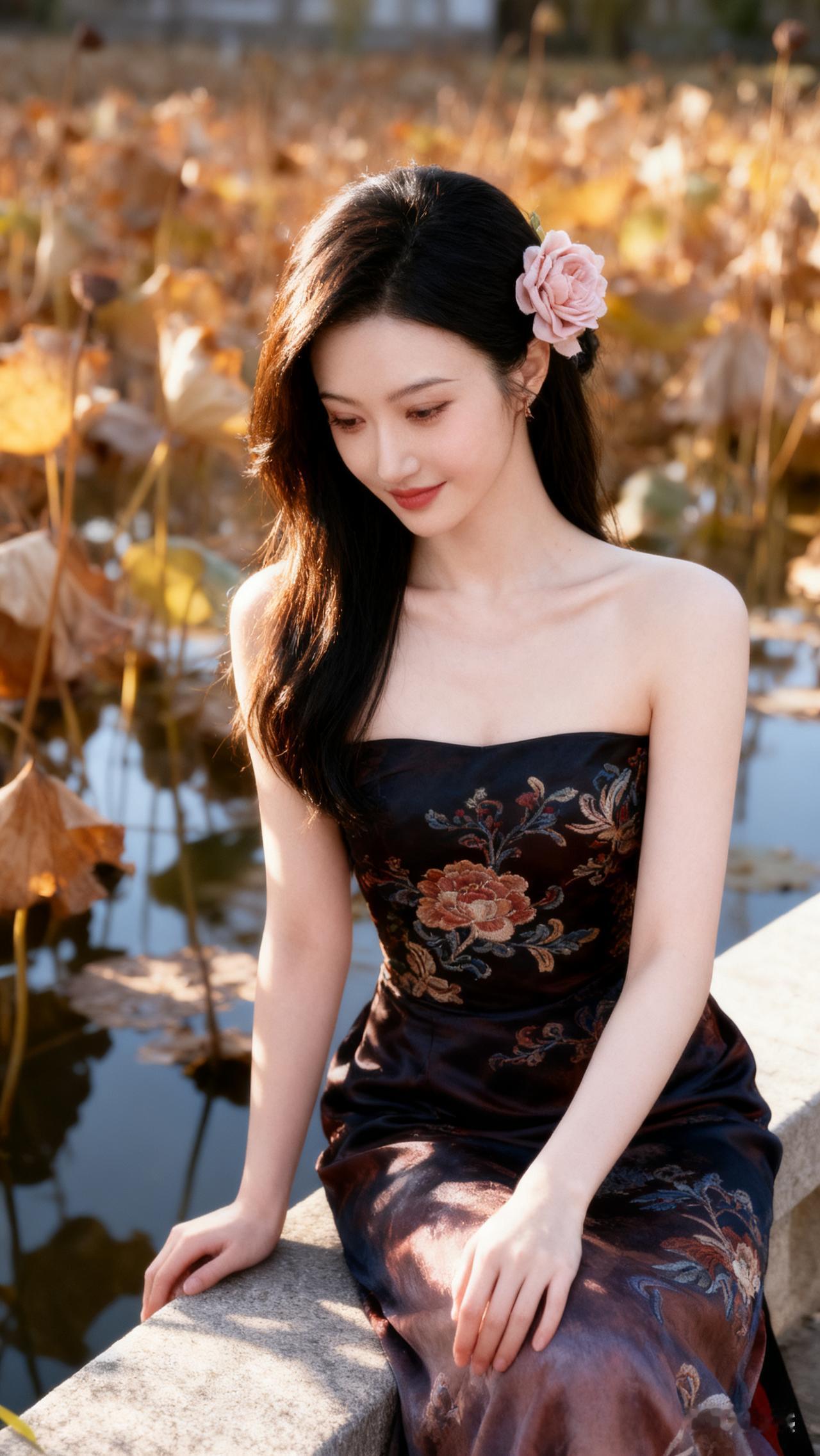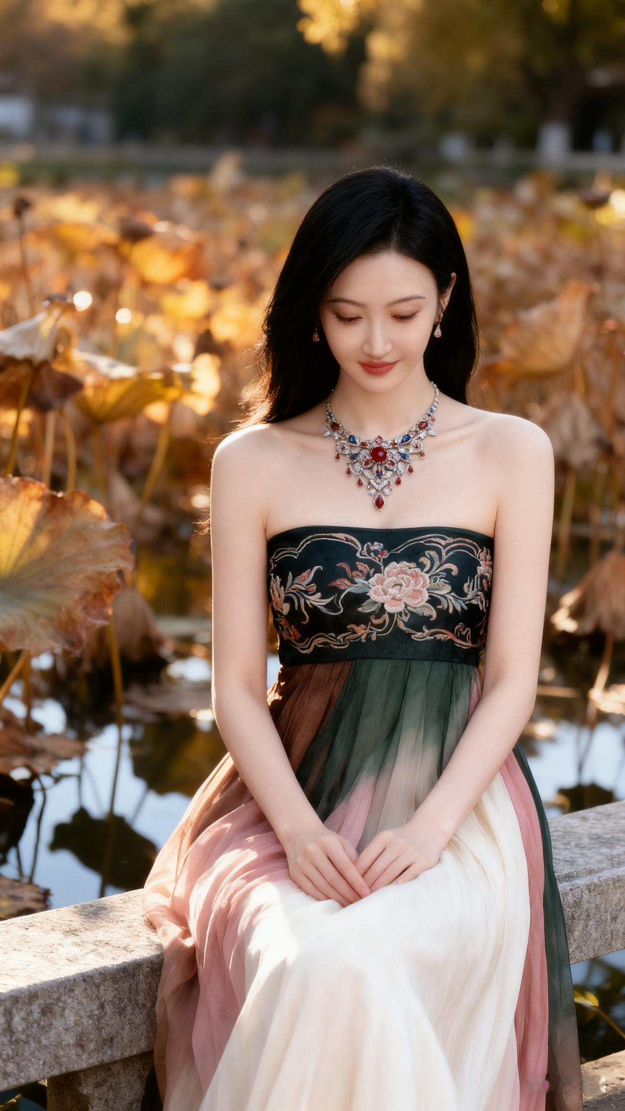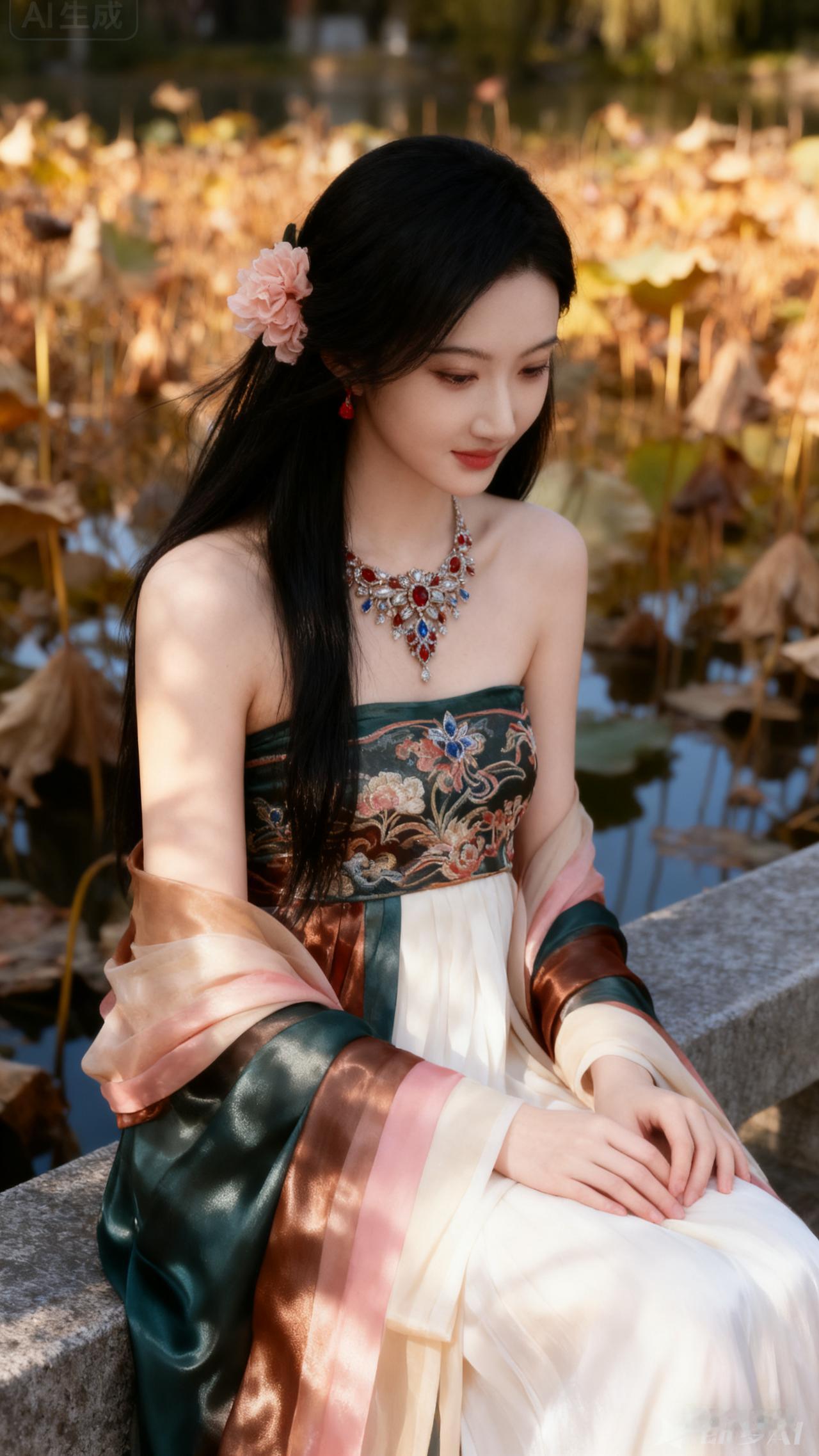 秋日荷塘边,少女轻倚石栏,粉花点缀发间,古风华服飘逸,如诗如画。