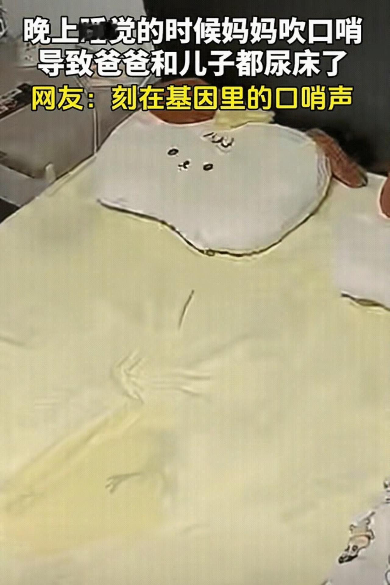 江苏一女的半夜睡不着,起来收拾屋子,心情好就吹口哨,声音在夜里传出去,丈夫和儿子睡得正香,被哨声吵醒,醒来发现床单湿了一片,父子俩都尿床了,丈夫第二天脸拉得老长,说她深更半夜吹什么口哨。 女的也没想到会这样,就是失眠嘛,起来动动手,哼个调子,口哨一响,屋里两个男的全醒了,醒了不说话,床单湿透,儿子小还能理解,丈夫一个大人也跟着尿,这事儿传出去邻居都笑,说怎么可能,口哨能把人吓成这样。 丈夫那会儿正做梦,梦里好像有警报声,迷迷糊糊醒过来,身下一片凉意,儿子也哭着喊妈妈,两个人对视一眼,场面挺尴尬,第二天就开始抱怨,说好好的家务白天做不行吗,非得半夜折腾,还吹口哨,这下好了,床单被罩全得换。 女的听了心里也委屈,失眠又不是她愿意的,起来干点活总比躺着翻来覆去强,口哨也就吹两声,谁知道能把人吓成这样,儿子尿床还能说是被吓到了,丈夫一个成年人也跟着尿,她自己都觉得不可思议。 网上看热闹的人多,有人说这丈夫身体得查查,正常人不至于被口哨吓尿,也有人劝女的以后注意点,大半夜确实不适合弄出动静,家里人睡觉呢,吹口哨声音又尖,突然来一下谁都受不了。 这事儿就这么僵着,丈夫觉得妻子不体谅人,妻子觉得自己挺无辜,父子俩的床单倒是换了好几轮,儿子晚上睡觉都不敢喝水,丈夫也开始注意睡前少喝点,生怕再来一回。 你们觉得,这女的到底该不该吹口哨。