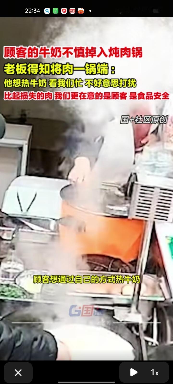 12月5日,山东青岛。顾客想用自己的方式热牛奶,牛奶不慎掉进炖肉锅,老板得知后把肉倒了。 当事老板称,牛奶是从包里拿出来的,不知道包里有什么,和什么东西接触过。比起损失的肉,更在意的是顾客,是食品安全。