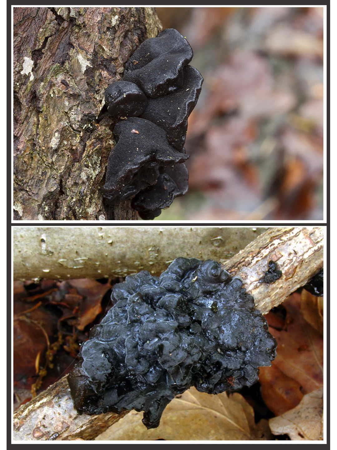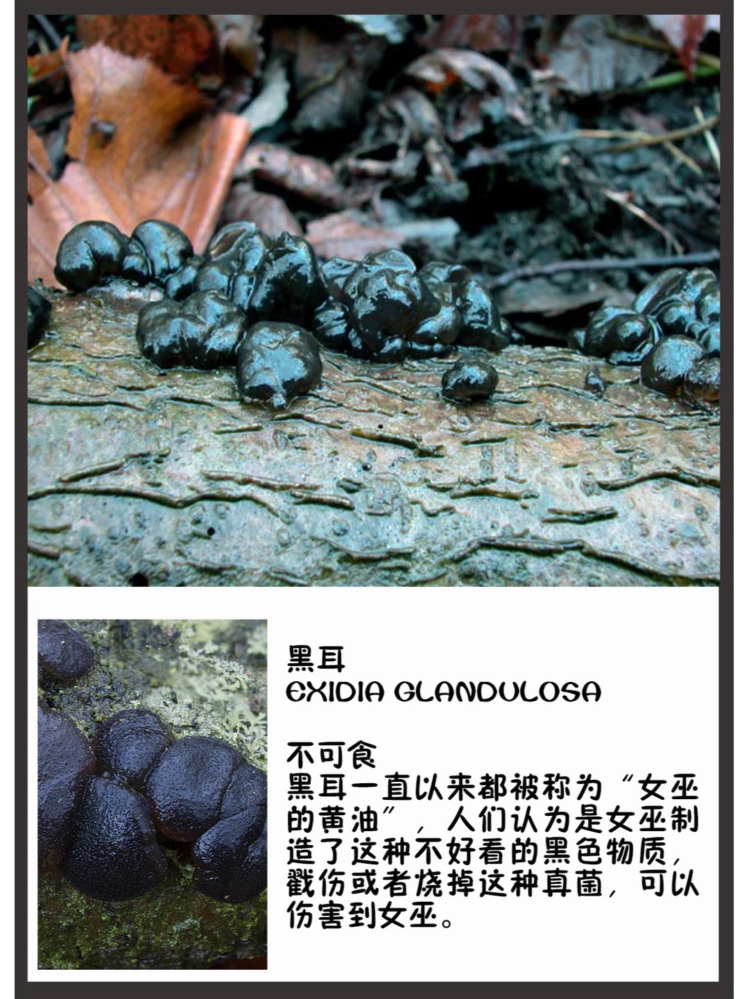 黑耳 exidia glandulosa 不可食 黑耳一直以来都被称为“女巫的黄油”,人们认为是女巫制造了这种不好看的黑色物质,戳伤或者烧掉这种真菌,可以伤害到女巫。
