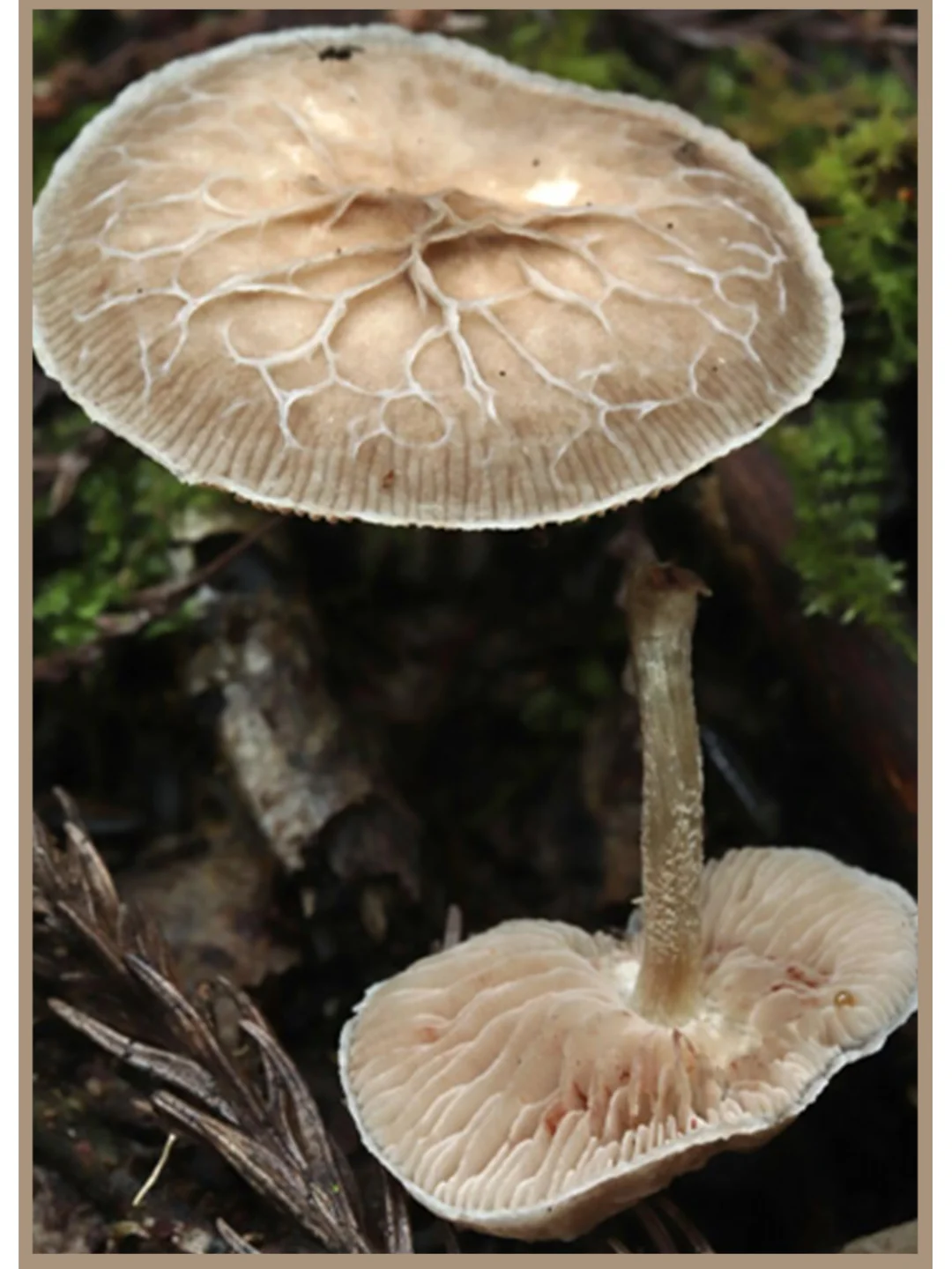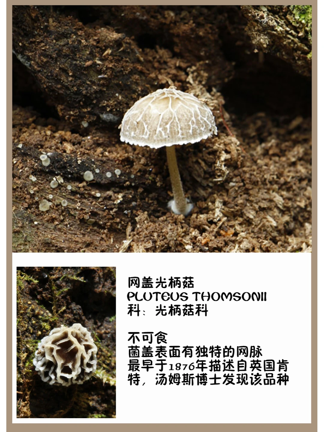 网盖光柄菇 Pluteus thomsonii 科:光柄菇科 图片©manatarka.org ©josef hlasek ©oso 不可食,菌盖表面有独特的网脉 最早于1876年描述自英国肯特,汤姆斯博士发现该品种