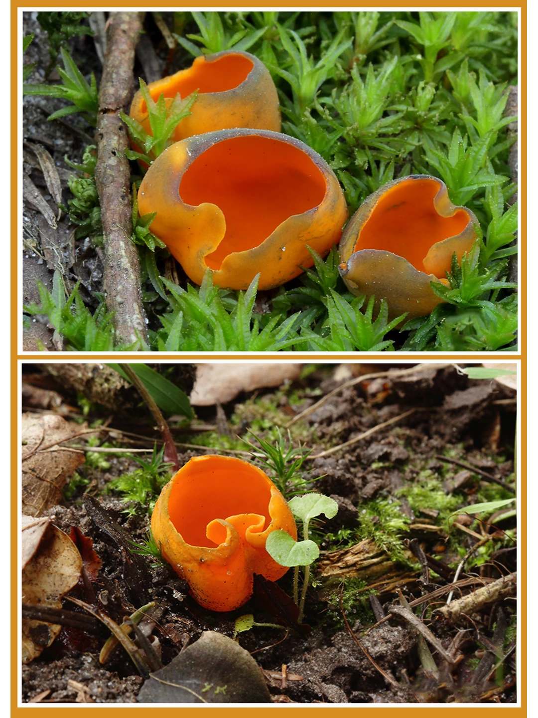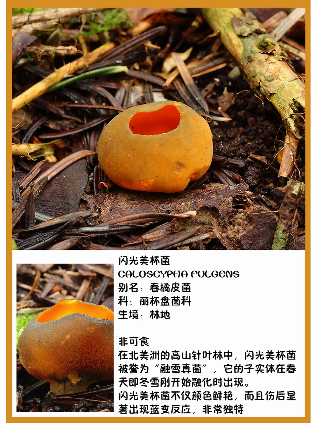 闪光美杯菌 Caloscypha fulgens 别名:春橘皮菌 科:丽杯盘菌科 生境:林地 非可食 在北美洲的高山针叶林中,闪光美杯菌被誉为“融雪真菌”,它的子实体在春天即冬雪刚开始融化时出现。 闪光美杯菌不仅颜色鲜艳,而且伤后显著出现蓝变反应,非常独特