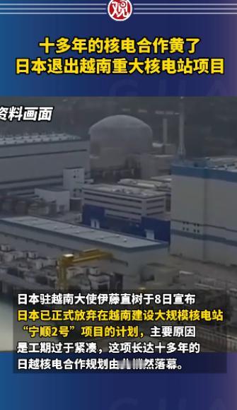 日本退出越南重大核电站项目 日本驻越南大使伊藤直树于8日宣布,日本已正式放弃在越南建设大规模核电站——“宁顺2号”项目的计划,主要原因是工期过于紧凑,这项长达十多年的日越核电合作规划由此悄然落幕。 先说说伊藤直树这位关键人物,他目前的身份是日本驻越南大使,正是他代表日方对外公布了退出决定。 有意思的是,公开信息里还有位同名的日本广告创意大师,但两者并非一人,这位大使的工作重心显然在外交与经贸领域,这次核电项目终止正是他近期公开的重要动向。 这事儿得从十几年前说起,2010年,越南总理和日本首相敲定合作,由日本负责宁顺2号核电站,俄罗斯则拿下旁边的1号项目,两座电站加起来能发4000兆瓦电,本来是越南能源战略的核心环节。 可2016年越南因为安全和预算问题暂停了项目,直到去年才重新启动,没想到刚把日本请回来,对方就撂了挑子。 说白了,工期紧凑更像个体面的借口,早在6月,就有日本官员偷偷透露,现在连能用的反应堆模型都没有,就算赶工最快也得2036年才能运营,实际可能要拖到2040年。 更深层的原因藏在日本核电产业的窘境里,2011年福岛事故后,日本国内重建耗光了大量人力财力,东芝、日立这些巨头在海外项目上接连亏损,根本没底气接这种大工程。 更巧的是,这段时间日越关系正有点微妙,之前河内市中心禁了燃油摩托,直接砸了日本本田的饭碗,日本使馆9月发了函,至今没收到回复,现在又退出核电项目,难免让人多想两者的关联。 对越南来说这可是个大麻烦,制造业越发展,电力缺口越明显,频繁停电早成了老大难。 俄罗斯的1号项目独木难支,法国、韩国、美国虽然表现出兴趣,但重新谈判又得花好几年。 这场拖了十几年的合作泡汤,越南的能源规划怕是要彻底改写了。 伊藤直树倒是留了话,说日本以后可能帮越南建小型模块化反应堆。 可这画的饼能不能兑现,谁也说不准,毕竟现在的日本核电产业,连自家的场子都还没完全收拾明白。 以上都是个人观点,对此您有什么不同的看法,可以在评论区留言讨论!!!
