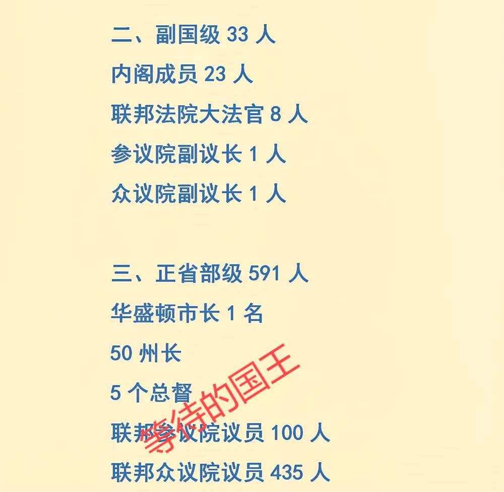 美国:有33位副国级干部。 美国:有591位省部级干部。 如图所示,美国正(副)国籍与省部级干部一览表。总共628人,其中总统、副总统、议长、大法官四人属于正国级。而内阁成员,比如国务卿、财政部长、国防部长等都属于副国级。然后各州、市、属地(总督)等地一把手,以及议员等都属于省部级。值得一提的就是美国的副总统,很多人都认为属于副国级,单纯的看副总统是副国级,但是根据美国宪法规定:副总统兼参议院议长,所以美国副总统也是正国级职务。