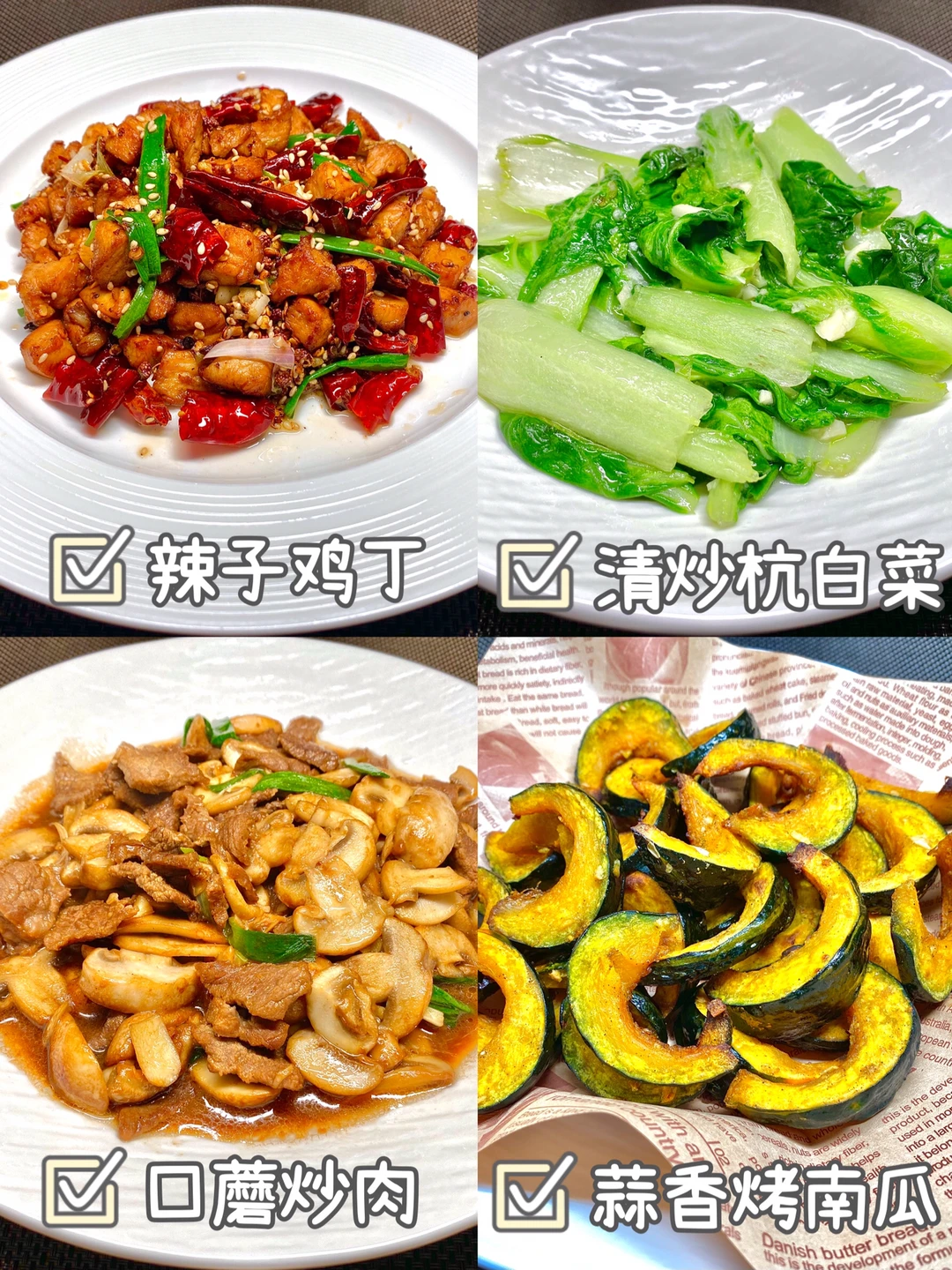 今天晚餐长这样 笔记灵感 分享下饭家常菜教程 具体做法往后翻,每道菜都有详细的教程介绍 今日菜单: 🏮辣子鸡丁 🏮清炒杭白菜 🏮口蘑炒肉 🏮蒜香烤南瓜 好好吃饭,拒绝外卖~