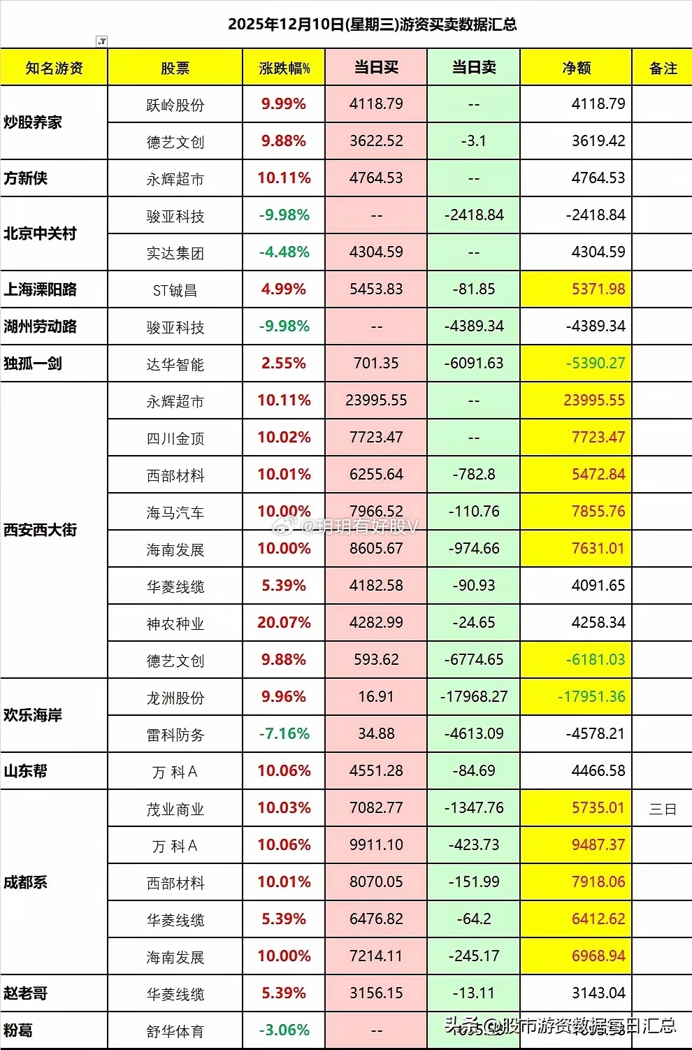 2025年12月10日 星期三方新侠 永辉超市 10.11% 买入4764.53万山东帮 万 科A 10.06% 买入4551.28万成都系 万 科A 10.06% 买入9911.10万 西部材料 10.01% 买入8070.05万 华菱线缆 5.39% 买入6476.82万海南发展 10.00% 买入7214.11万欢乐海岸 龙洲股份 9.96% 卖出-17968.27万 雷科防务 -7.16% 卖出-4613.09万独孤一剑 达华智能 2.55% 卖出-6091.63万西安西大街 永辉超市 10.11% 买入23995.55万 四川金顶 10.02% 买入7723.47万 西部材料 10.01% 买入6255.64万 海马汽车 10.00% 买入7966.52万 海南发展 10.00% 买入8605.67万 德艺文创 9.88% 卖出-6774.65万万科 在 2025 年 12 月 10 日涨停,核心是20 亿元债券展期审议落地预期 + 境内债大涨修复市场信心,叠加行业房贷贴息政策预期升温、公司自身债务优化及大股东支持等多重因素共振,大股东深铁集团累计提供 291.3 亿元低息借款,利率最低 2.34%,大幅缓解公司资金压力;同时万科境内新增融资综合成本降至 3.44%,债务结构持续优化。