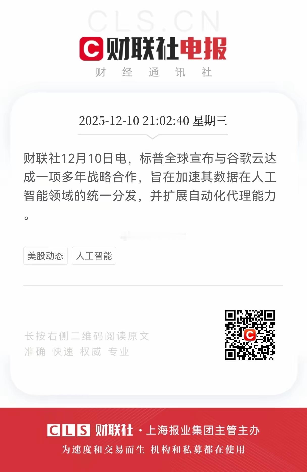 突发重大利好!标普全球宣布与谷歌云达成战略合作,明天谷歌云相关概念股恐怕要起飞了,咱们来梳理梳理A股里和其相关联的企业有哪些?12月10日,标普全球宣布与谷歌云达成一项多年战略合作,这家全球知名的数据服务商宣布达成多年战略合作,打算借力谷歌云的人工智能技术,加速自家数据在AI领域的分发效率,同时还要把自动化代理能力“火力全开”。简单说,就是以后标普的数据能更快、更智能地触达用户,AI工具也会变得更懂市场、更“懂你”。这事儿对金融市场可不简单,标普的数据可是不少投资机构的“决策指南针”,现在和谷歌云的AI能力一结合,从风险评估到市场分析,效率可能直接翻倍。说到底,这波合作的核心就是“数据+AI”的强强联合。标普有海量的金融数据和客户资源,谷歌云有硬核的AI技术和云计算能力,俩巨头联手,既是为了在AI驱动的金融数据市场里抢滩,也是在给整个行业“打样”:未来的金融数据服务,拼的不再是单纯的数据量,而是谁能更快、更智能地把数据变成“真金白银”的决策建议。A股谷歌云/AI相关产业链概念股:1. 云基础设施/硬件工业富联(601138):谷歌云服务器核心代工厂,承接谷歌AI服务器订单。中际旭创(300308):谷歌800G/1.6T光模块核心供应商,占其采购份额超50%。长飞光纤(601869):谷歌超低损耗光纤核心供应商,市场份额60%。沪电股份(002463):为谷歌TPU(AI芯片)供应高端PCB板。2. AI数据/应用蓝色光标(300058):谷歌全球顶级广告代理,接入Gemini大模型优化AI营销,与数据分发场景协同。易点天下(301171):谷歌广告+云服务代理,Kreado AI平台与谷歌大模型深度集成。3. 散热/配套英维克(002837):谷歌数据中心液冷系统供应商,市场份额25%。