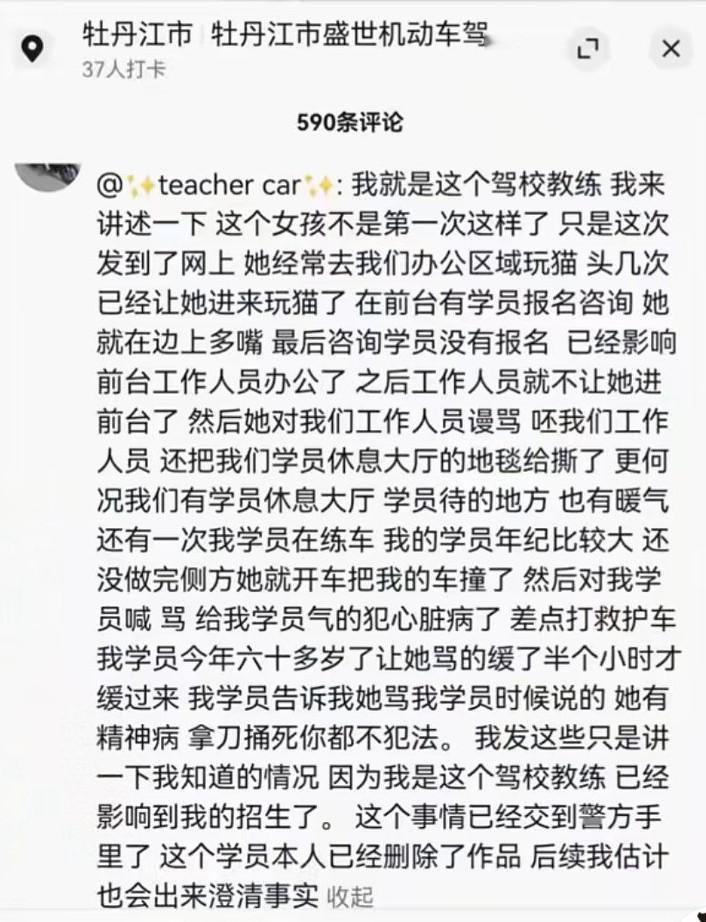 黑龙江牡丹江。女子发视频称在驾校练完车后,因外面天气太冷想在驾校服务大厅待几分钟,遭工作人员强行驱赶,推倒在地…… 随后,有自称驾校教练的网友称,驾校的学员休息厅有暖气,这女孩经常跑到办公区玩猫,不让她玩就哭闹报警…… 这位驾校教练还表示:据其他学员透露“女子自称有,拿刀捅死人都不犯法”。目前,女子已经将视频删除,后续她本人可能也会出来澄清事实真相。 当时,女子将视频发布到网上后,网上都是骂这个驾校和那个工作人员的声音。可当这个驾校教练发声一出来后,网上又是另外一种声音了,都在说“小仙女太会整事情”。 如果稍后官方出一通告,说这个女的没有错,网络上的风向是不是又要变啊!不得不说,舆论风向真的太容易受到裹挟了! 这起争执中,你更愿意相信哪一方?