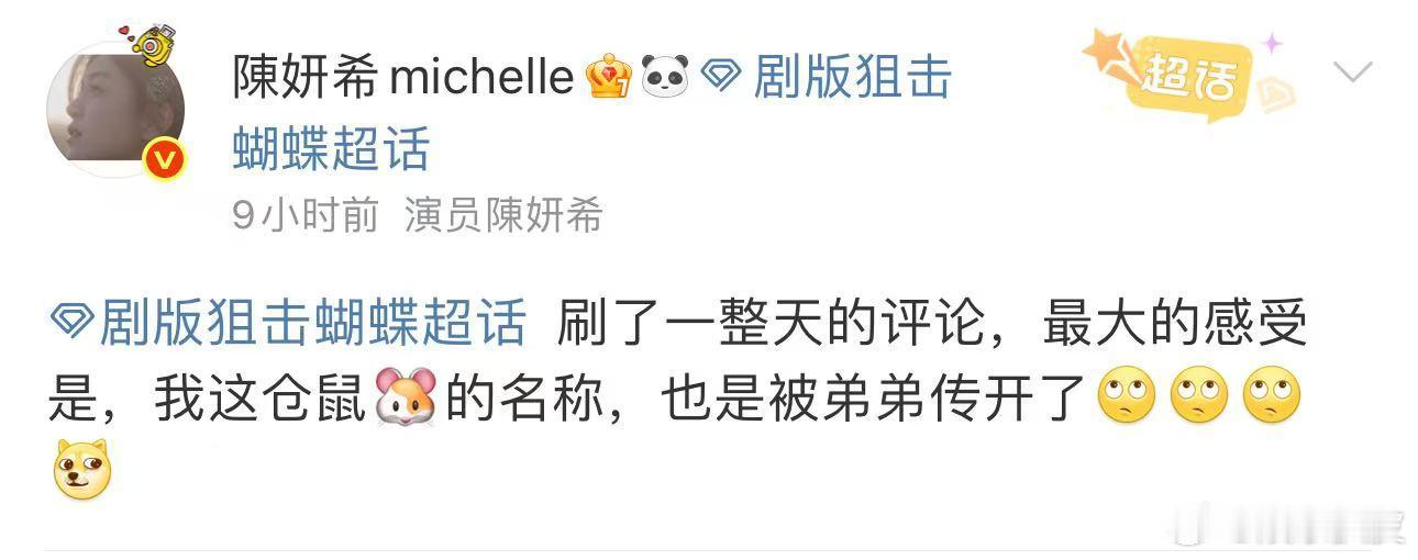 陈妍希回应仓鼠名称陈妍希刷了一整天的评论,表示仓鼠名称也是被周柯宇传开了哈哈哈哈,get不到陈妍希仓鼠塑的有难了,真的很可爱好嘛