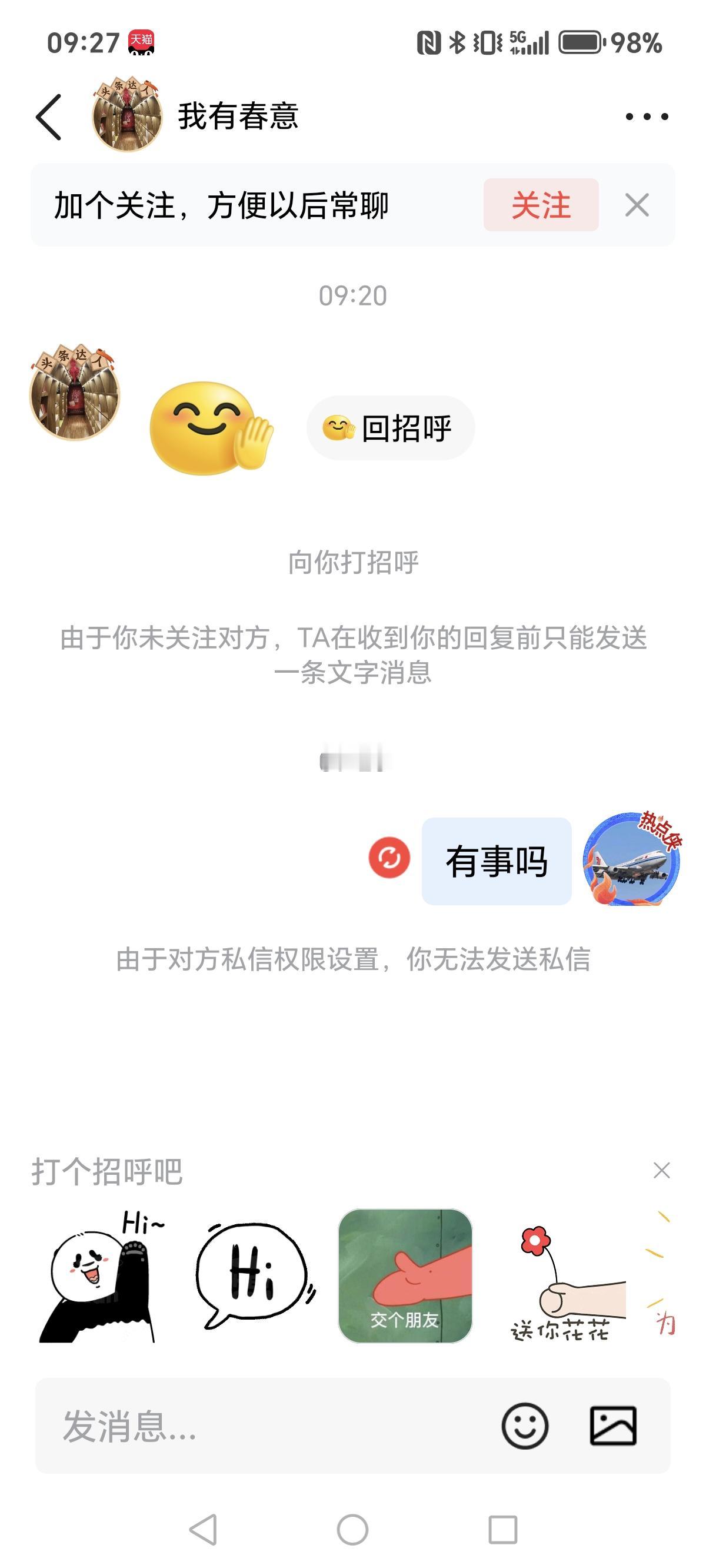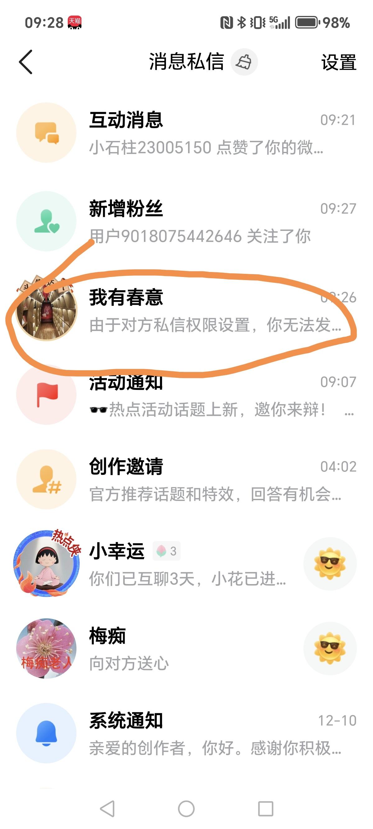 时常收到非关注本人的陌生人私信打招呼,然而,回复时,却是对方“由于对方私信权限设置,你无法发送私信设置限制”,奉劝这些陌生人,要相互尊重,既然你私信别人,别人也有权回复,否则,你以为你是谁?