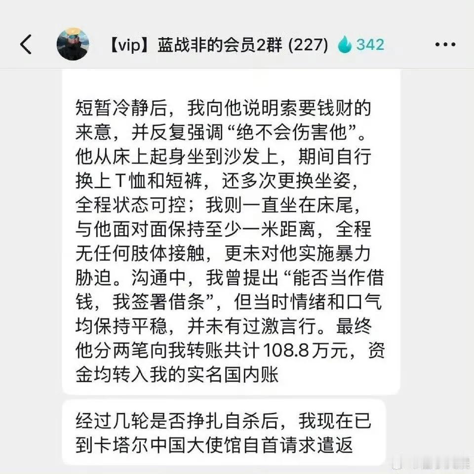 疑似蓝战非被绑架事件当事人在其群内“自首”,称自己现在已经准备去卡塔尔中国大使馆自首! 这剧情转变也太快了!看了整篇只突出了一个重点,临时起意,和航空公司和酒店和出租车没有一毛钱关系[允悲][允悲] 大家细品?