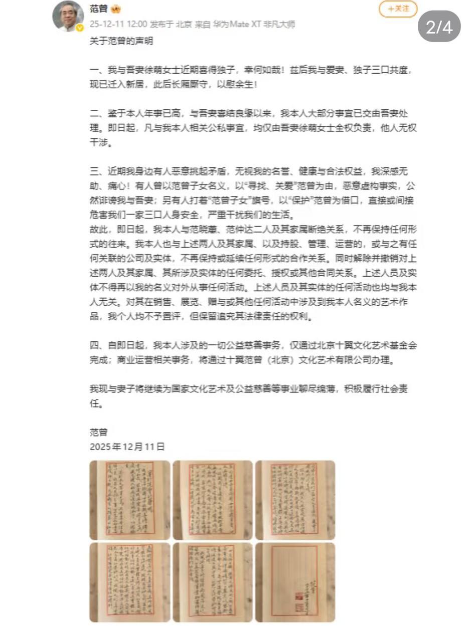 范曾再次公开露面并发布郑重声明: 1、和爱妻喜得独子。 2、本人相关公私事宜,都交由爱妻全权处理。 3、断绝和亲生女儿、继子的亲属关系。 …… 公开资料显示:范曾,1938年生,江苏南通人,加上现在的徐萌女士,总共有四段婚姻。其中声明中提到要断绝关系的范晓惠是他和第二任妻子边宝华女士所生。 像范曾这样的大师,他所创造的艺术成就,我们只有膜拜的份。而他的感情生活,我们旁人也无可置喙,毕竟每个人有每个人的活法!