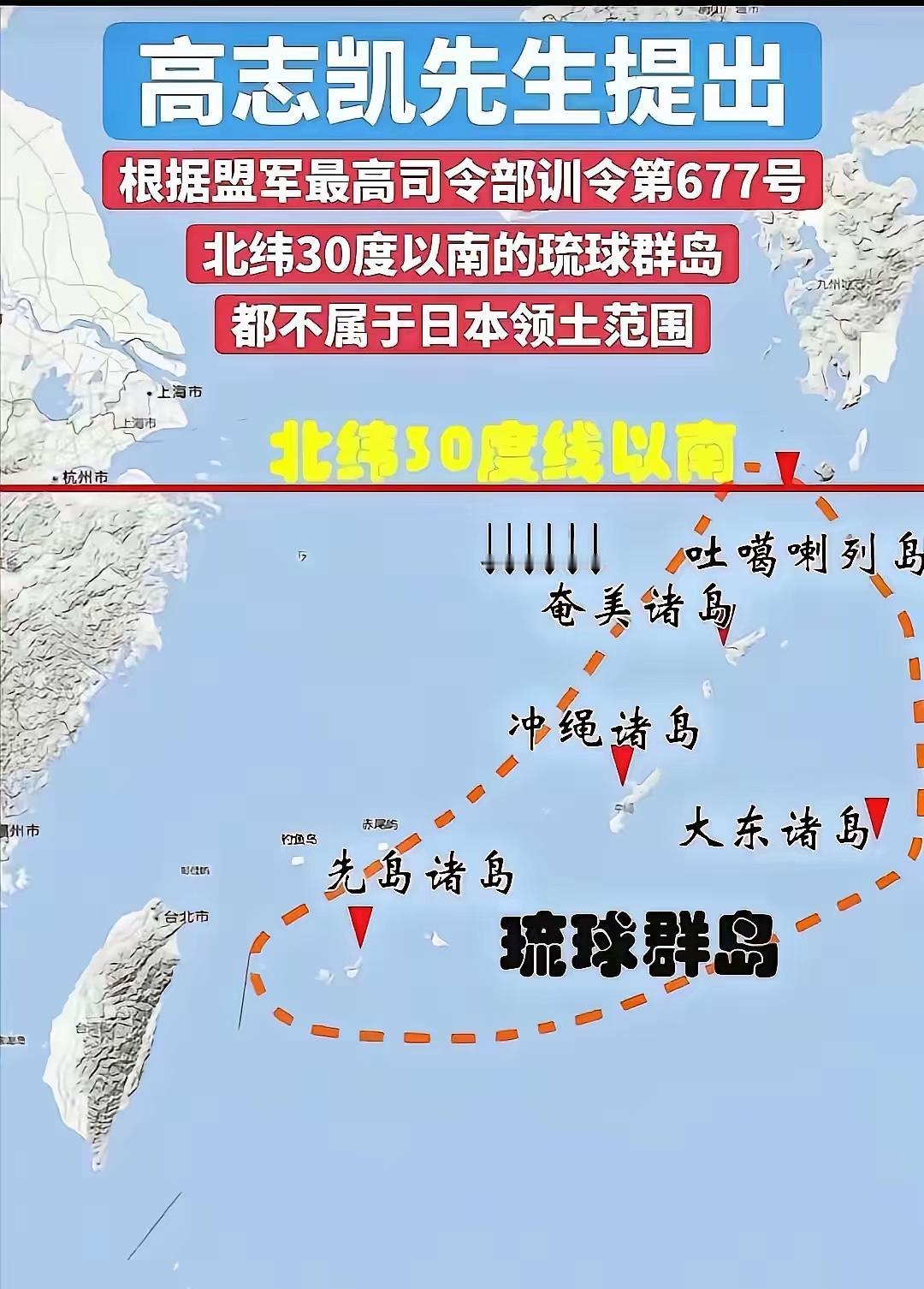 真厉害👍👍👍 高志凯教授把盟军最高司令部训令677号都扒出来了,并明确指出:北纬30度以南的琉球群岛,根本不属于日本领土的范围。 真别说,这事一摊开摆在桌面上,就是这么清清楚楚、明明白白。训令677号可不是哪家自媒体瞎编的东西,那可是战后盟军给日本画下的硬杠杠,相当于直接告诉日本:哪些地方你能管,哪些地方你碰都别想碰。结果现在小日子过得好了,反倒忘了谁给它规矩立的,开始各种“历史重写”,真把大家当健忘症患者了。 琉球那块地方,当年界定得可透亮了,北纬30度以南统统跟日本没关系,施政权就是不给它。换句话说,那些地方压根不在它的“户口本”上,现在却老想往身上贴。这就像把邻居家的地当自己小院说事,越说越离谱。更搞笑的是,日本还一副理直气壮的样子,仿佛说得多了,历史就能给它改写了似的。 高志凯教授这次把原文件翻出来,就是要把这股子迷糊劲给掰直。不但掰直,还敲得铿锵有力。那些被剥离的地区写得明明白白:郁陵岛、竹岛、济州岛、琉球群岛、伊豆、小笠原、千岛、齿舞、色丹……名单长得一眼看不完。要真照着这份文件说,小日本现在该沉默的,不是我们。 说句大白话,日本这七八十年来,一直对这些地方抱着“我说算”的心态,自己给自己加戏,可惜国际法不是话剧社,换不了剧本。尤其是琉球,当地不少人心里门儿清,对日本的归属感也不强,说不好听的,谁到底“属于”谁,还真未必能摆得那么死板。可在日本媒体的嘴里,那就变成了天经地义的“自家领土”,真是把脸皮练得铜墙铁壁。 更别说那种“装糊涂”的态度,只要别人不戳破,它就当大家都忘了历史。可历史就是历史,它不像泡面泡久了还能涨点形状;文件摆在那里,哪怕黄了、旧了、卷边了,内容也不会自动改。 这事儿最耐人寻味的,就是日本现在对外一边喊得震天响,一边又特别怕别人翻老账。只要一提到开罗宣言、波茨坦公告、训令677号这些东西,它立刻装聋作哑。可问题来了:你既然敢拿领土说事,那这些文书就必须一起拿出来对照着看。不能挑着吃,只吃甜的,苦的到一边丢。 大家都知道,日本战后能重新站起来,是因为国际社会管得宽、给得多。可它越发展越“飘”,特别在领土问题上越走越偏,还真的以为沉默等于默认。现在有人把文件翻出来,等于是把灯光打开,让它那些想藏的心思无处可藏。 说到底,领土问题不是靠嗓门大,也不是靠重复一万次就能变真。谁对谁错,文件就在那儿,历史就在那儿。高志凯教授这次把677号一亮,小日本那点所谓的“底气”,立马变成了纸片风干,轻轻一碰,碎一地。